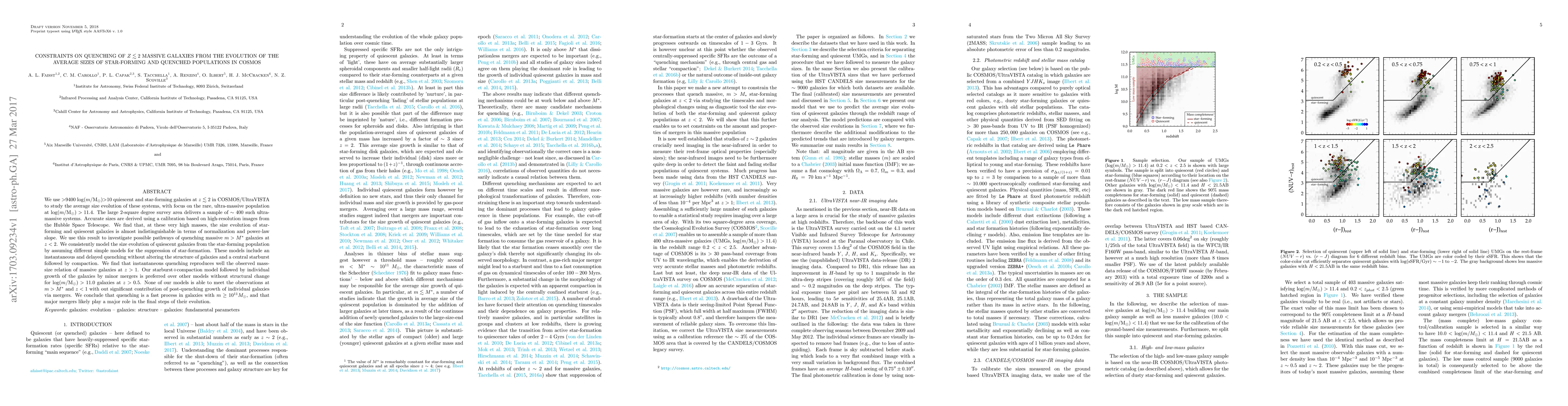 We use $>$9400 $\log(m/M_{\odot})>10$ quiescent and star-forming galaxies at $z\lesssim2$ in COSMOS/UltraVISTA to study the average size evolution of these systems, with focus on the rare, ultra-massive population at $\log(m/M_{\odot})>11.4$. The large 2-square degree survey area delivers a sample of $\sim400$ such ultra-massive systems. Accurate sizes are derived using a calibration based on high-resolution images from the Hubble Space Telescope. We find that, at these very high masses, the size evolution of star-forming and quiescent galaxies is almost indistinguishable in terms of normalization and power-law slope. We use this result to investigate possible pathways of quenching massive $m>M^*$ galaxies at $z<2$. We consistently model the size evolution of quiescent galaxies from the star-forming population by assuming different simple models for the suppression of star-formation. These models include an instantaneous and delayed quenching without altering the structure of galaxies and a central starburst followed by compaction. We find that instantaneous quenching reproduces well the observed mass-size relation of massive galaxies at $z>1$. Our starburst$+$compaction model followed by individual growth of the galaxies by minor mergers is preferred over other models without structural change for $\log(m/M_{\odot})>11.0$ galaxies at $z>0.5$. None of our models is able to meet the observations at $m>M^*$ and $z<1$ with out significant contribution of post-quenching growth of individual galaxies via mergers. We conclude that quenching is a fast process in galaxies with $ m \ge 10^{11} M_\odot$, and that major mergers likely play a major role in the final steps of their evolution.
