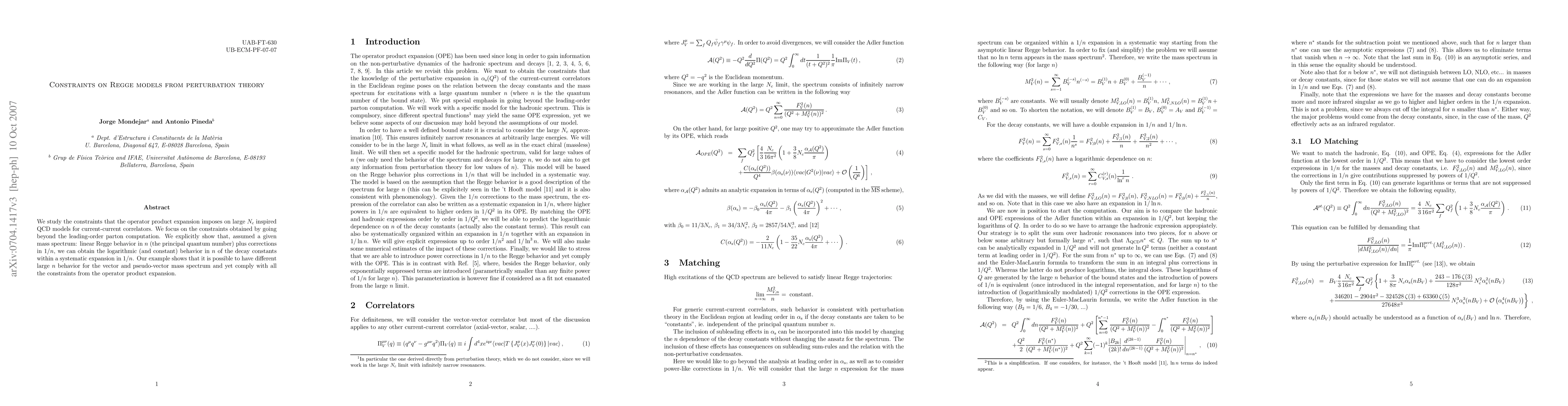 We study the constraints that the operator product expansion imposes on large $N_c$ inspired QCD models for current-current correlators. We focus on the constraints obtained by going beyond the leading-order parton computation. We explicitly show that, assumed a given mass spectrum: linear Regge behavior in $n$ (the principal quantum number) plus corrections in $1/n$, we can obtain the logarithmic (and constant) behavior in $n$ of the decay constants within a systematic expansion in $1/n$. Our example shows that it is possible to have different large $n$ behavior for the vector and pseudo-vector mass spectrum and yet comply with all the constraints from the operator product expansion.