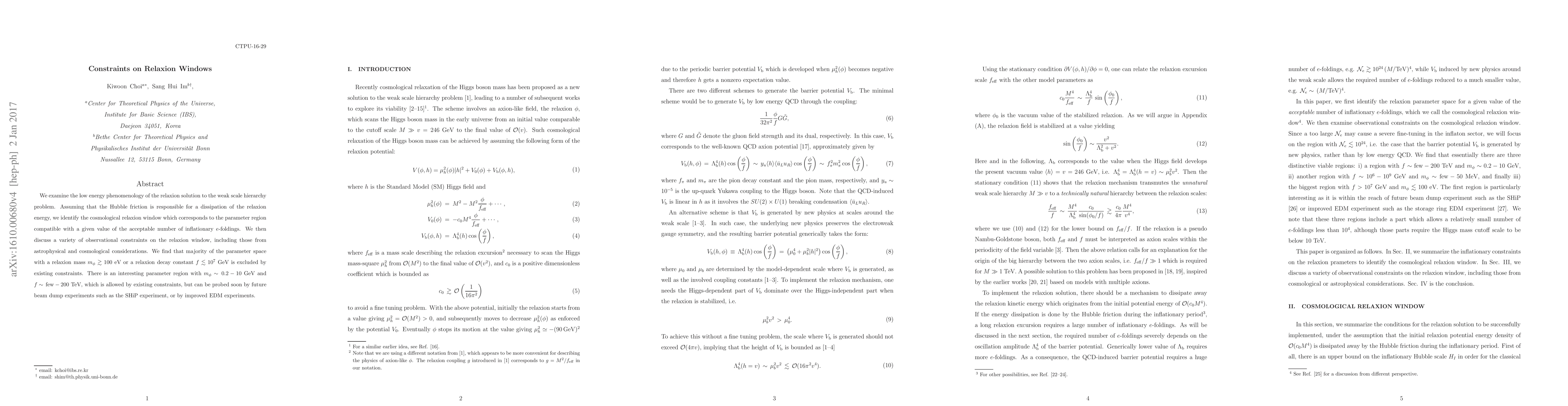 We examine the low energy phenomenology of the relaxion solution to the weak scale hierarchy problem. Assuming that the Hubble friction is responsible for a dissipation of the relaxion energy, we identify the cosmological relaxion window which corresponds to the parameter region compatible with a given value of the acceptable number of inflationary $e$-foldings. We then discuss a variety of observational constraints on the relaxion window, including those from astrophysical and cosmological considerations. We find that majority of the parameter space with a relaxion mass $m_\phi\gtrsim 100$ eV or a relaxion decay constant $f\lesssim 10^7$ GeV is excluded by existing constraints. There is an interesting parameter region with $m_\phi\sim \,0.2-10$ GeV and $f\sim\, {\rm few}-200$ TeV, which is allowed by existing constraints, but can be probed soon by future beam dump experiments such as the SHiP experiment, or by improved EDM experiments.