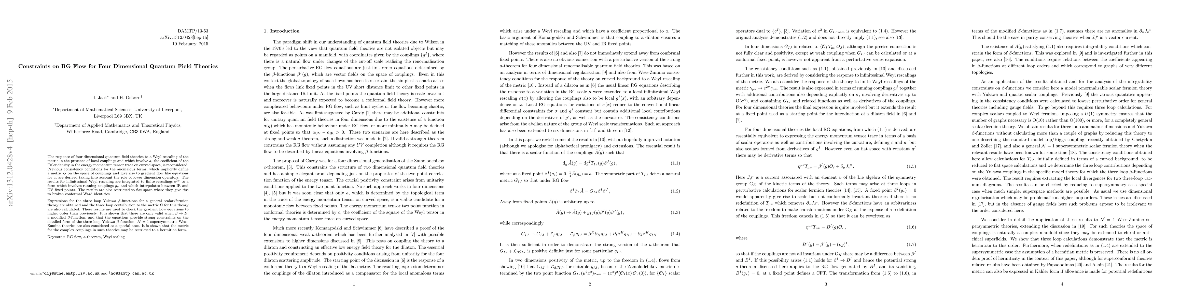 The response of four dimensional quantum field theories to a Weyl rescaling of the metric in the presence of local couplings and which involve $a$, the coefficient of the Euler density in the energy momentum tensor trace on curved space, is reconsidered. Previous consistency conditions for the anomalous terms, which implicitly define a metric $G$ on the space of couplings and give rise to gradient flow like equations for $a$, are derived taking into account the role of lower dimension operators. The results for infinitesimal Weyl rescaling are integrated to finite rescalings $e^{2\sigma}$ to a form which involves running couplings $g_\sigma$ and which interpolates between IR and UV fixed points. The results are also restricted to flat space where they give rise to broken conformal Ward identities. Expressions for the three loop Yukawa $\beta$-functions for a general scalar/fermion theory are obtained and the three loop contribution to the metric $G$ for this theory are also calculated. These results are used to check the gradient flow equations to higher order than previously. It is shown that these are only valid when $\beta \to B$, a modified $\beta$-function, and that the equations provide strong constraints on the detailed form of the three loop Yukawa $\beta$-function. ${\cal N}=1$ supersymmetric Wess-Zumino theories are also considered as a special case. It is shown that the metric for the complex couplings in such theories may be restricted to a hermitian form.