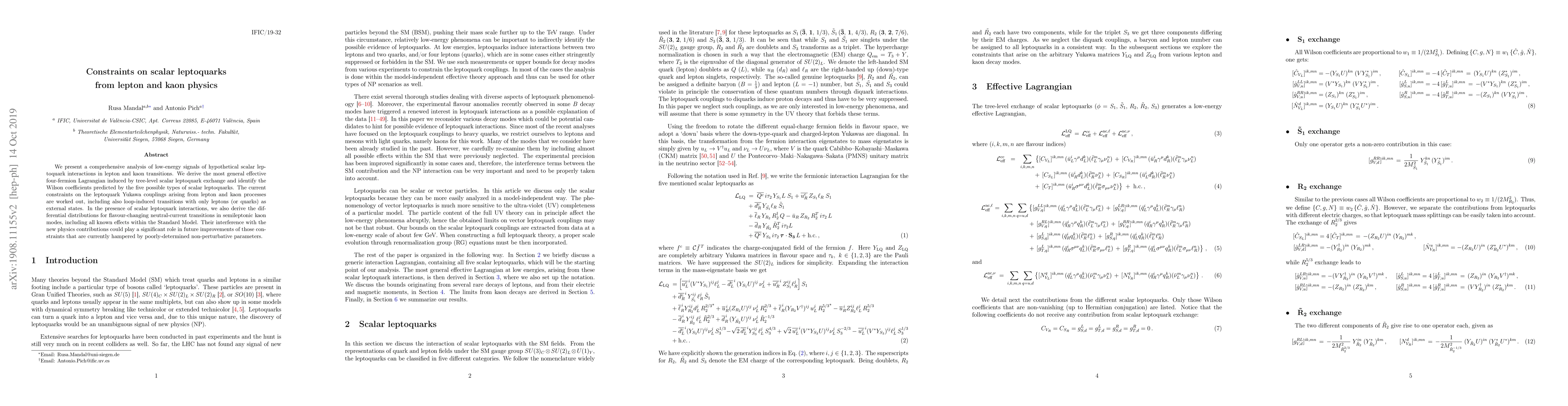 The paper derives the Wilson coefficients predicted by five possible types of scalar leptoquarks and identifies the constraints on their Yukawa couplings from lepton and kaon processes, including loop-induced transitions.