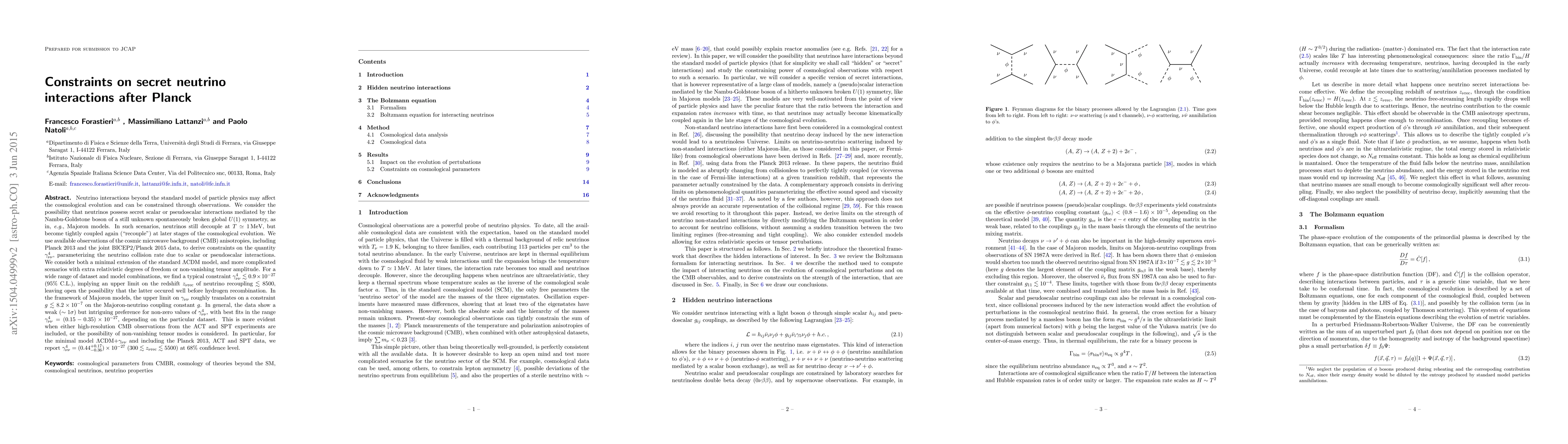 This paper constrains secret neutrino interactions beyond the standard model using observations from the Planck satellite and other CMB data. The study finds that secret (pseudo)scalar interactions, such as those in Majoron models, are limited by $\gamma_{\nu \nu}^4 < 0.9\times 10^{-27}$ (95% C.L.), implying a redshift of neutrino recoupling $< 8500$. The data weakly suggest non-zero interaction values, with best fits in the range $(0.15 - 0.35)\times10^{-27}$.