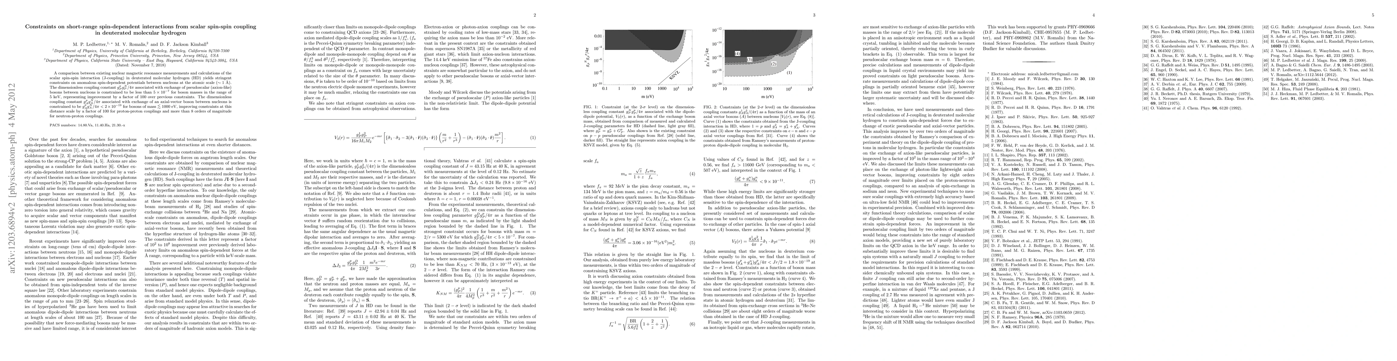 This paper constrains short-range spin-dependent interactions by analyzing scalar spin-spin coupling in deuterated molecular hydrogen (HD), improving limits on pseudoscalar and axial-vector boson exchanges between nucleons by factors of 100 and more than 8 orders of magnitude respectively, compared to previous dipole-dipole interaction measurements.
