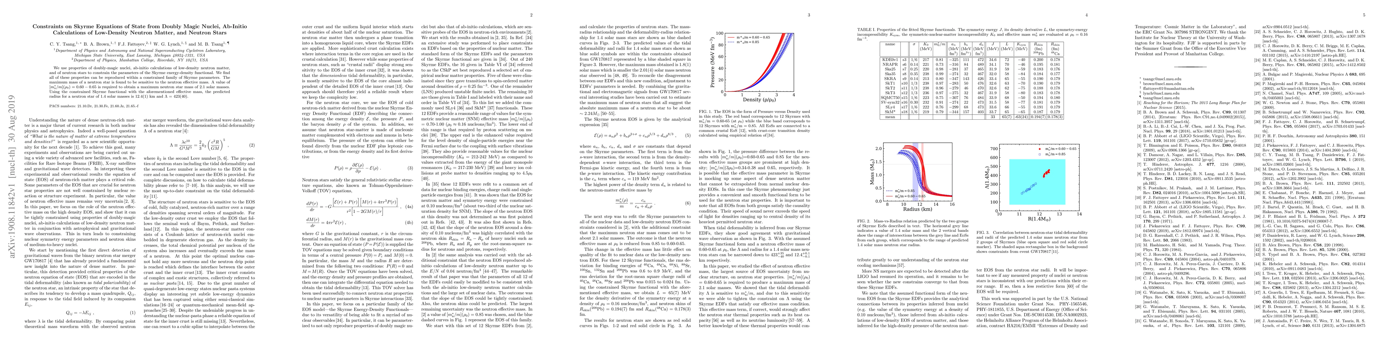 This paper constrains the Skyrme energy-density functional using properties of doubly-magic nuclei, ab-initio calculations of low-density neutron matter, and neutron stars. It finds a maximum neutron star mass of 2.1 solar masses requires a neutron effective mass ratio of 0.60-0.65, predicting a neutron star radius of 12.4(1) km for a 1.4 solar mass star.