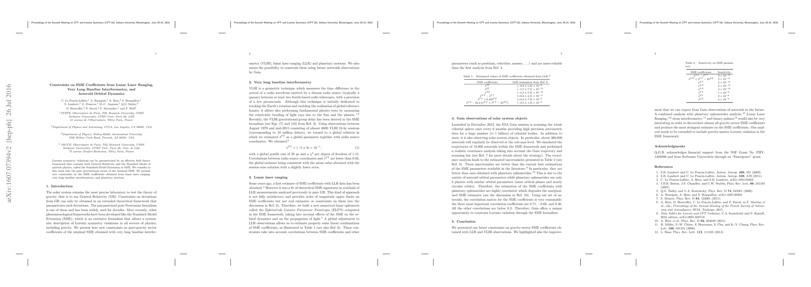 This paper presents new constraints on coefficients in the Standard-Model Extension (SME) that describe potential Lorentz symmetry violations, focusing on the pure gravitational sector, and utilizes data from lunar laser ranging, very long baseline interferometry, and asteroid orbital dynamics.