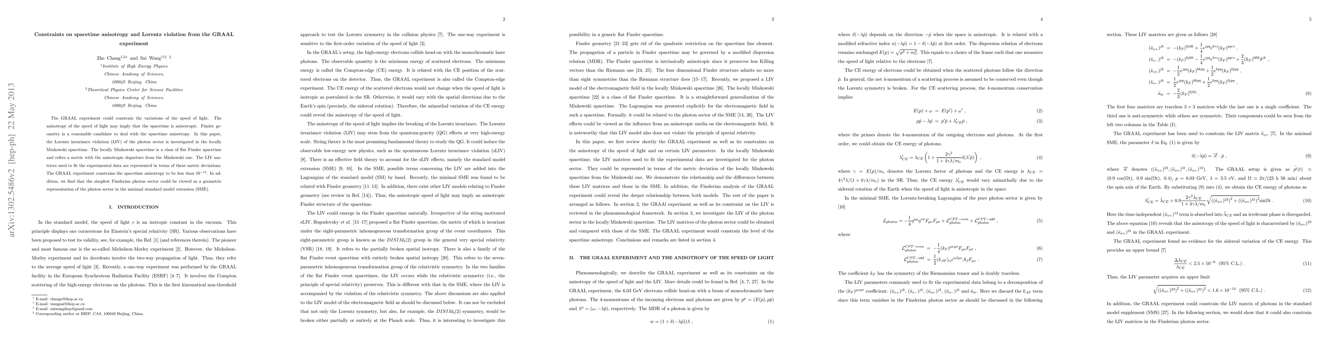 The GRAAL experiment investigates Lorentz invariance violation (LIV) in the photon sector using locally Minkowski spacetime, constraining spacetime anisotropy to less than \(10^{-14}\). The study finds that the simplest Finslerian photon sector aligns with the minimal standard model extension (SME).