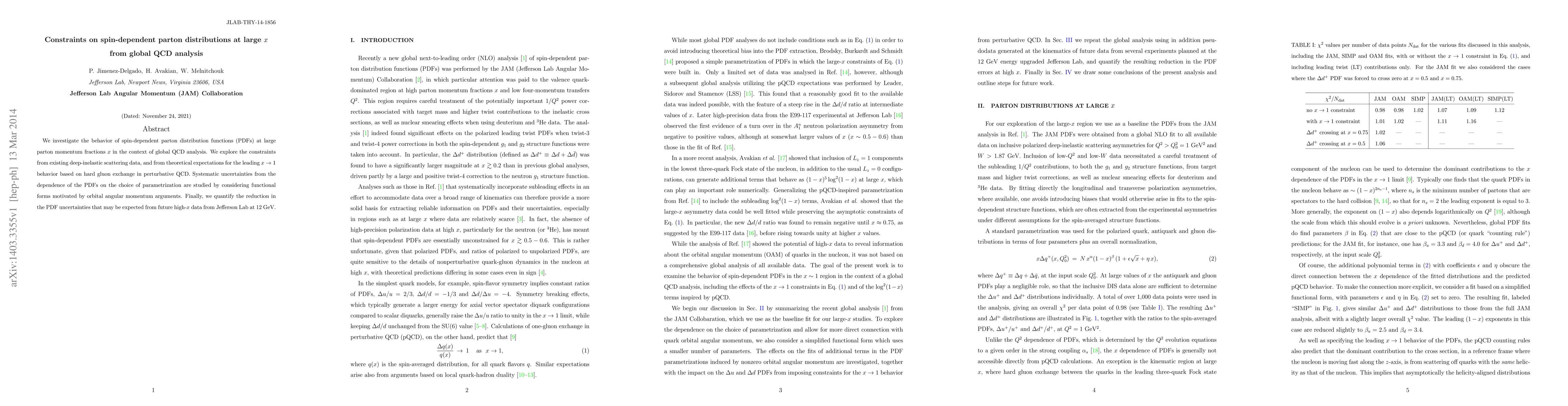 We investigate the behavior of spin-dependent parton distribution functions (PDFs) at large parton momentum fractions x in the context of global QCD analysis. We explore the constraints from existing deep-inelastic scattering data, and from theoretical expectations for the leading x -> 1 behavior based on hard gluon exchange in perturbative QCD. Systematic uncertainties from the dependence of the PDFs on the choice of parametrization are studied by considering functional forms motivated by orbital angular momentum arguments. Finally, we quantify the reduction in the PDF uncertainties that may be expected from future high-x data from Jefferson Lab at 12 GeV.