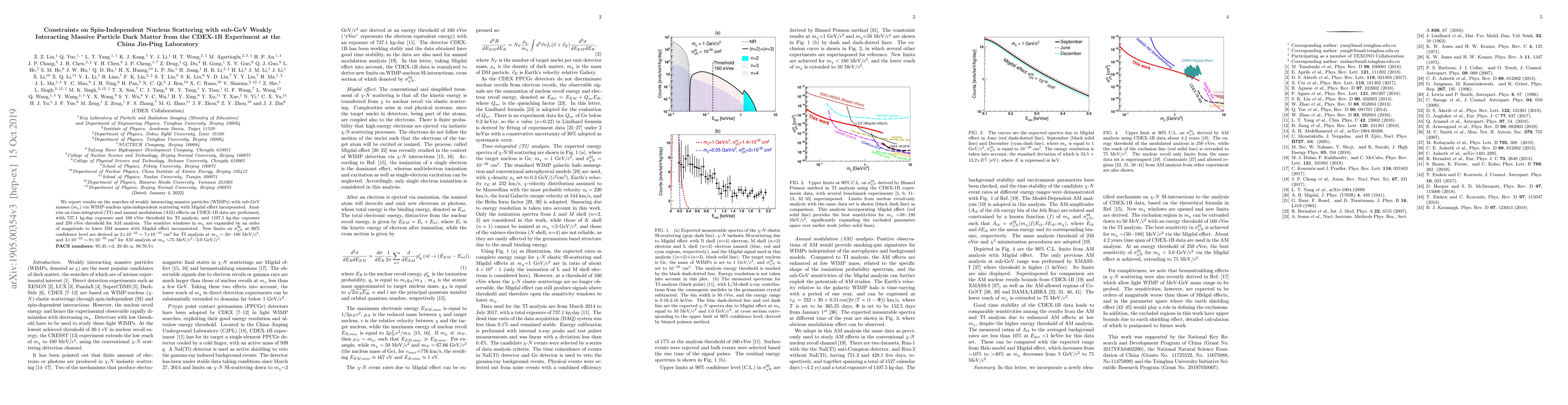 The CDEX-1B experiment at China Jin-Ping Laboratory reports new constraints on sub-GeV weakly interacting massive particles (WIMPs) via spin-independent scattering, including the Migdal effect. The study expands sensitive mass windows and derives new limits on spin-independent cross-sections, improving previous results significantly.