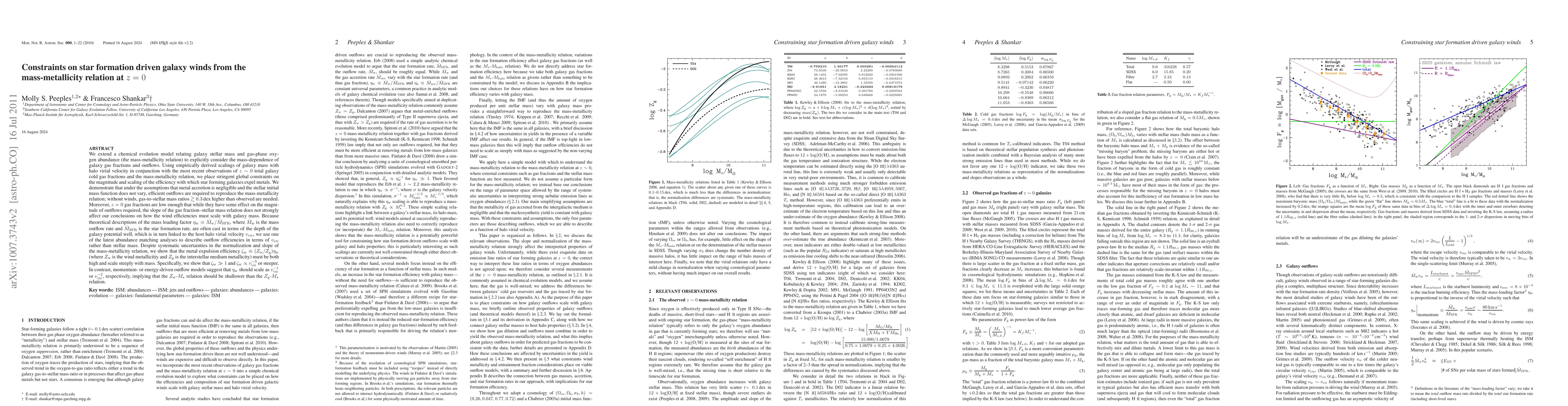We extend a chemical evolution model relating galaxy stellar mass and gas-phase oxygen abundance (the mass-metallicity relation) to explicitly consider the mass-dependence of galaxy gas fractions and outflows. Using empirically derived scalings of galaxy mass with halo virial velocity in conjunction with the most recent observations of z~0 total galaxy cold gas fractions and the mass-metallicity relation, we place stringent global constraints on the magnitude and scaling of the efficiency with which star forming galaxies expel metals. We demonstrate that under the assumptions that metal accretion is negligible and the stellar initial mass function does not vary, efficient outflows are required to reproduce the mass-metallicity relation; without winds, gas-to-stellar mass ratios >~ 0.3 dex higher than observed are needed. Moreover, z=0 gas fractions are low enough that while they have some effect on the magnitude of outflows required, the slope of the gas fraction--stellar mass relation does not strongly affect our conclusions on how the wind efficiencies must scale with galaxy mass. Despite systematic uncertainties in the normalization and slope of the mass-metallicity relation, we show that the metal expulsion efficiency zetaw=(Zw/Zg)etaw (where Zw is the wind metallicitiy and Zg is the interstellar medium metallicity) must be both high and scale steeply with mass. Specifically, we show that zetaw >> 1 and zetaw proportional to vvir^-3 or steeper. In contrast, momentum- or energy-driven outflow models suggest that etaw should scale as vvir^-1 or vvir^-2, respectively, implying that the Zw-Mstar relation should be shallower than the Zg-Mstar relation. [abridged]