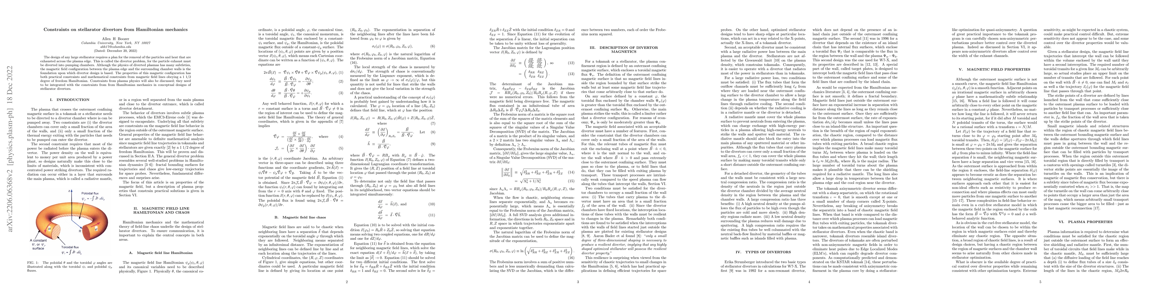 The design of any large stellarator requires a plan for the removal of the particles and heat that are exhausted across the plasma edge. This is called the divertor problem, for the particle exhaust must be diverted into pumping chambers. Although the physics of diverted plasmas has many subtleties, the magnetic field configuration between the plasma edge and the surrounding chamber walls is the foundation upon which divertor design is based. The properties of this magnetic configuration has both practical constraints and mathematical constraints from magnetic field lines obeying a 1~1/2 degree of freedom Hamiltonian. Constraints from plasma physics will also be discussed; they need to be integrated with the constraints from from Hamiltonian mechanics in conceptual designs of stellarator divertors.