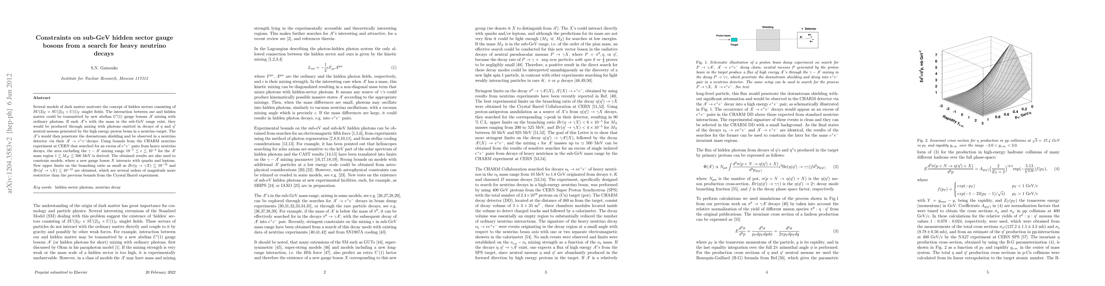 Several models of dark matter motivate the concept of hidden sectors consisting of SU(3)_C x SU(2)_L x U(1)_Y singlet fields. The interaction between our and hidden matter could be transmitted by new abelian U'(1) gauge bosons A' mixing with ordinary photons. If such A's with the mass in the sub-GeV range exist, they would be produced through mixing with photons emitted in two photon decays of \eta,\eta' neutral mesons generated by the high energy proton beam in a neutrino target. The A's would then penetrate the downstream shielding and be observed in a neutrino detector via their A'-> e+e- decays. Using bounds from the CHARM neutrino experiment at CERN that searched for an excess of e+e- pairs from heavy neutrino decays, the area excluding the \gamma - A' mixing range 10^{-7} < \epsilon < 10^{-4} for the A' mass region 1 < M_A' <500 MeV is derived. The obtained results are also used to constrain models, where a new gauge boson X interacts with quarks and leptons. New upper limits on the branching ratio as small as Br(\eta -> \gamma X) < 10^{-14} and Br(\eta' -> \gamma X) < 10^{-12} are obtained, which are several orders of magnitude more restrictive than the previous bounds from the Crystal Barrel experiment.