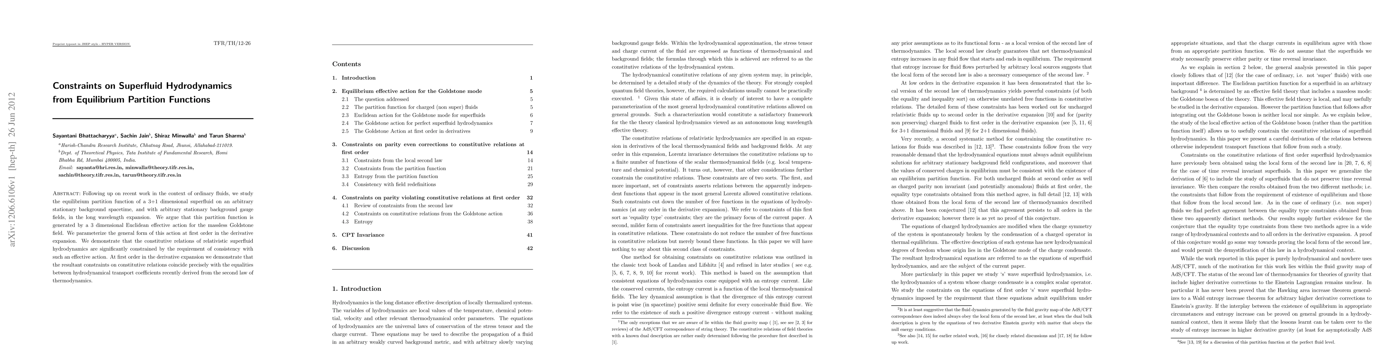 This paper investigates the equilibrium partition function of a 3+1 dimensional superfluid, revealing constraints on its hydrodynamics through a 3D Euclidean effective action for the massless Goldstone field. The study shows that these constraints match the transport coefficients derived from thermodynamic principles.