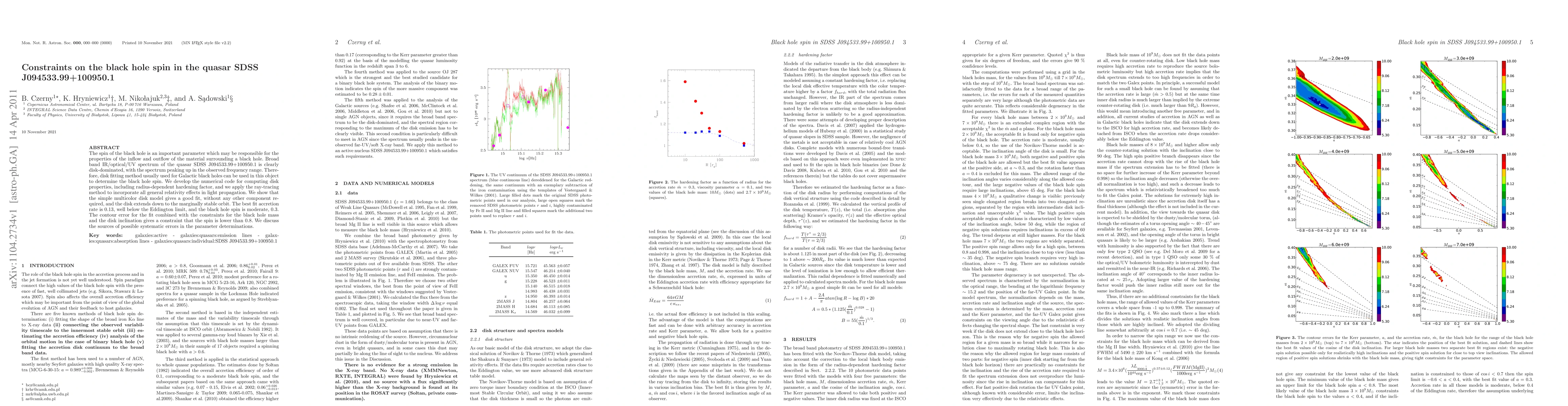 This paper determines the spin of the black hole in quasar SDSS J094533.99+100950.1 using disk fitting methods and numerical modeling, finding a moderate spin value of 0.3, with a constraint that the spin is less than 0.8. The study also discusses potential systematic errors in the parameter determinations.