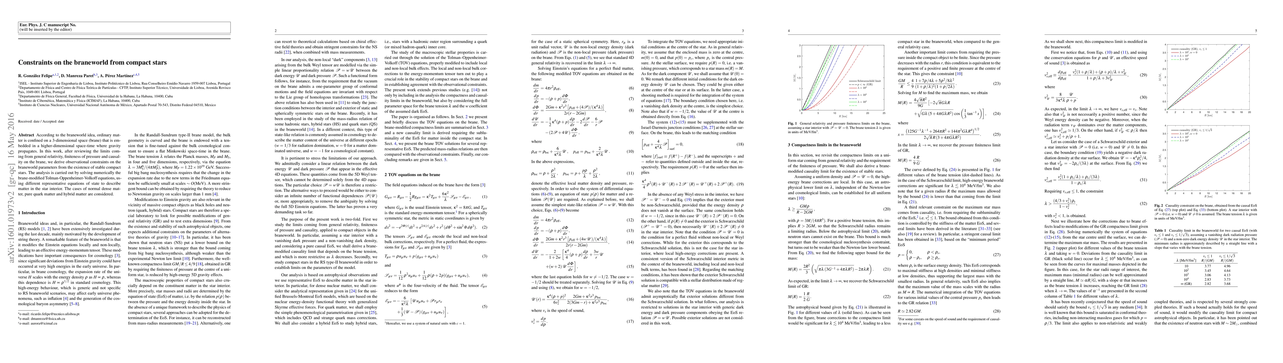 This paper derives observational constraints on braneworld parameters by analyzing the stability of compact stars, solving brane-modified Tolman-Oppenheimer-Volkoff equations numerically, and considering various equations of state for star interiors, including normal dense matter, pure quark matter, and hybrid matter.