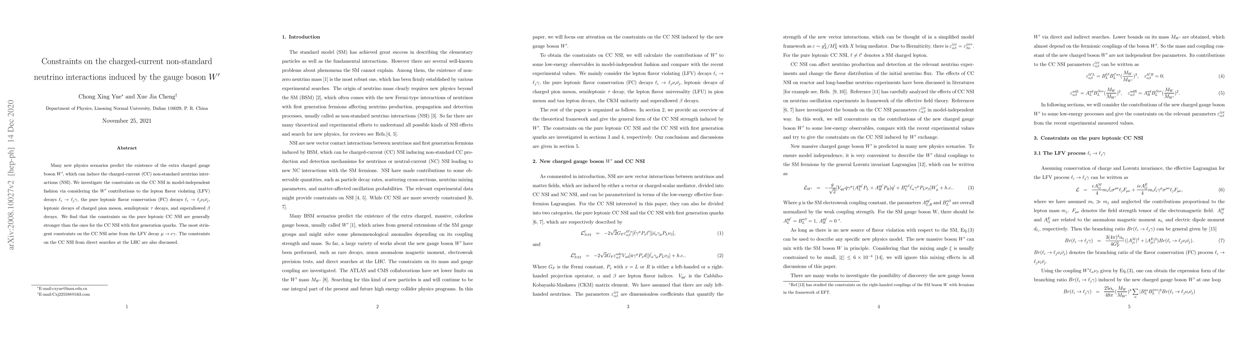 This paper investigates constraints on charged-current non-standard neutrino interactions (NSI) induced by an extra gauge boson $W'$ through various decay processes. The most stringent limits on these interactions come from the lepton flavor violating decay $\mu \rightarrow e\gamma$.