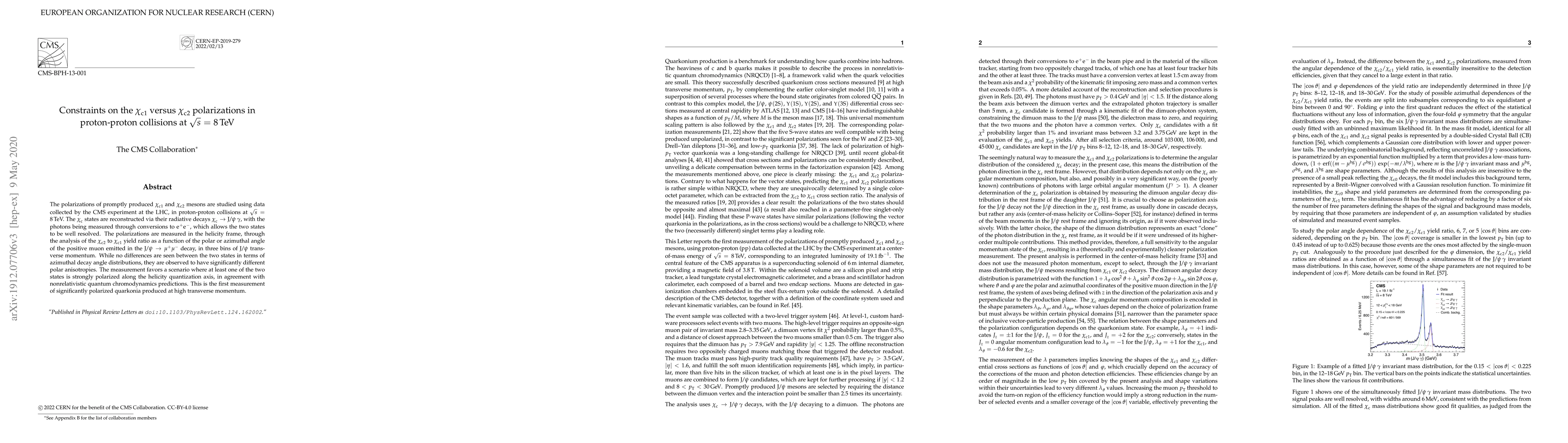 The polarizations of promptly produced $\chi_\mathrm{c1}$ and $\chi_\mathrm{c2}$ mesons are studied using data collected by the CMS experiment at the LHC, in proton-proton collisions at $\sqrt{s} = $ 8 TeV. The $\chi_\mathrm{c}$ states are reconstructed via their radiative decays $\chi_\mathrm{c}$ $\to$ $\mathrm{J}/\psi\, \gamma$, with the photons being measured through conversions to e$^+$e$^-$, which allows the two states to be well resolved. The polarizations are measured in the helicity frame, through the analysis of the $\chi_\mathrm{c2}$ to $\chi_\mathrm{c1}$ yield ratio as a function of the polar or azimuthal angle of the positive muon emitted in the $\mathrm{J}/\psi$ $\to$ $\mu^+\mu^-$ decay, in three ranges of $\mathrm{J}/\psi$ transverse momentum. While no differences are seen between the two states in terms of azimuthal decay angle distributions, they are observed to have significantly different polar anisotropies. The measurement favors a scenario where at least one of the two states is strongly polarized along the helicity quantization axis, in agreement with nonrelativistic quantum chromodynamics predictions. This is the first measurement of significantly polarized quarkonia produced at high transverse momentum.