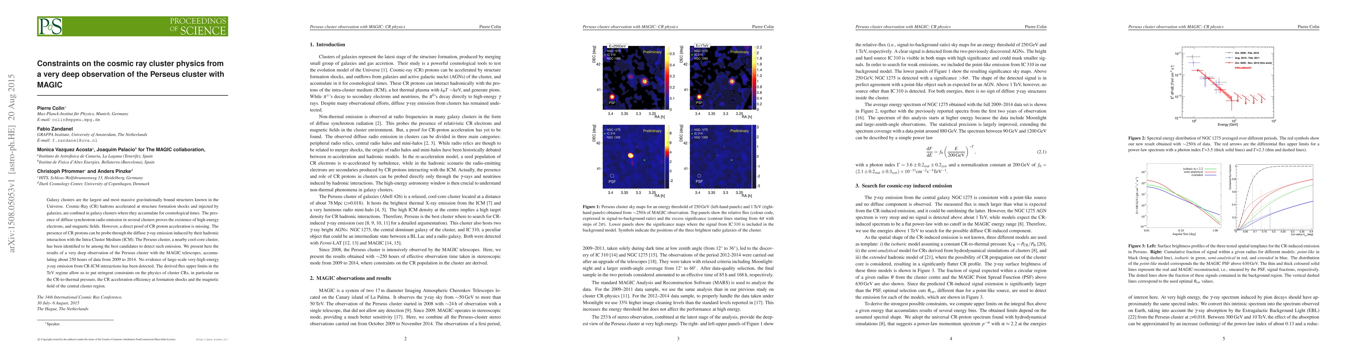 The MAGIC telescopes conducted a very deep observation of the Perseus cluster, yielding no evidence of large-scale very-high-energy gamma-ray emission from cosmic ray-intracluster medium interactions. This result provides stringent constraints on cosmic ray physics, including CR-to-thermal pressure ratio, CR acceleration efficiency, and magnetic field strength in the central cluster region.
