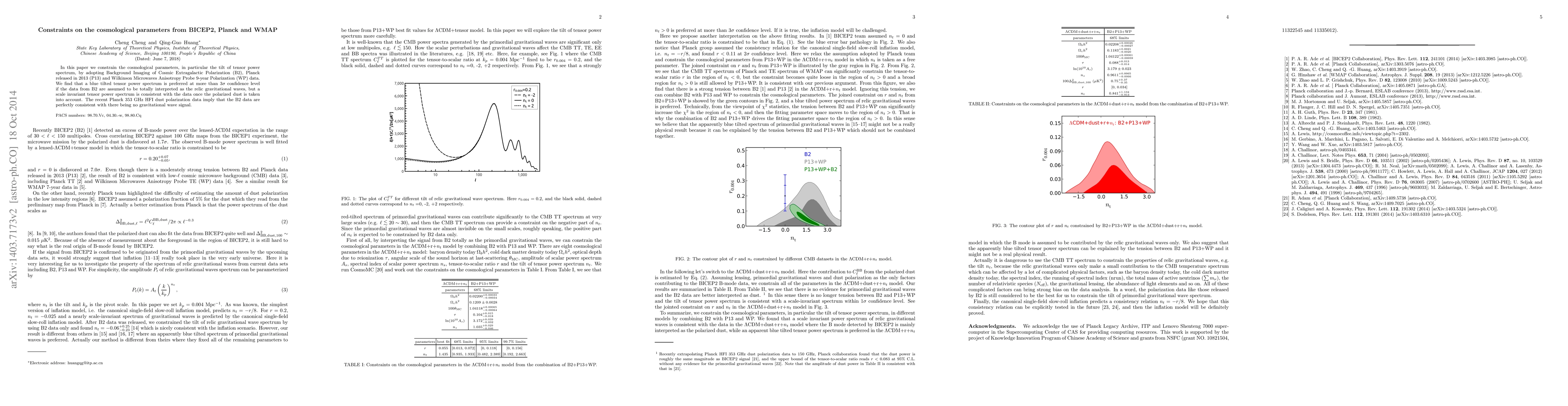 This paper constrains cosmological parameters using BICEP2, Planck 2013, and WMAP data, finding a blue-tilted tensor power spectrum favored at high confidence if BICEP2 data is solely interpreted as gravitational waves. However, when considering polarized dust, a scale-invariant tensor spectrum aligns better with the data, suggesting no significant gravitational wave signal.