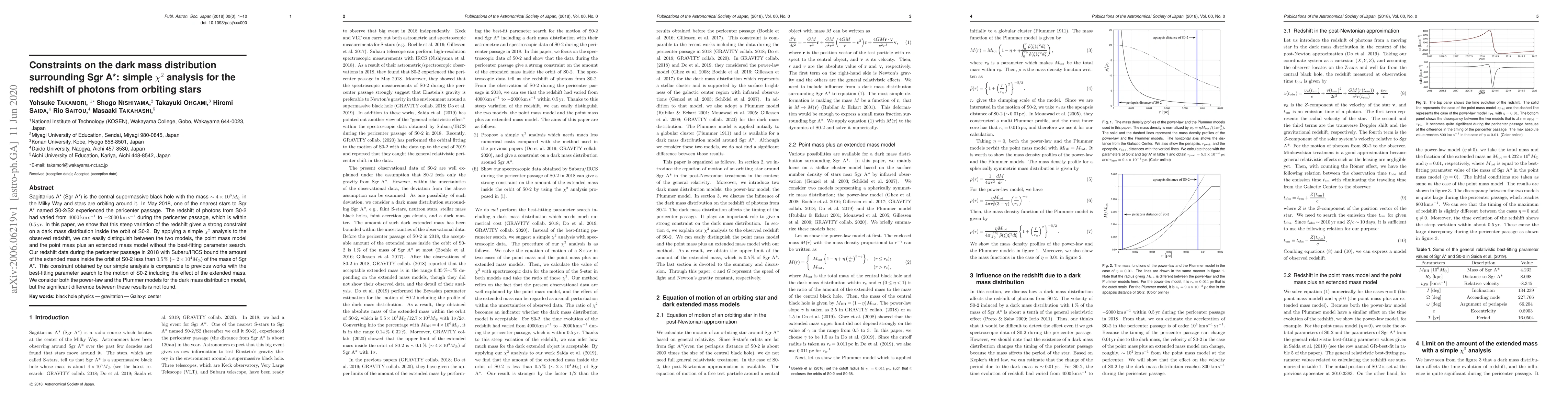 The paper presents a simple $chi^2$ analysis of redshift variations from star S0-2's orbit around Sgr A*, constraining any dark mass inside its orbit to less than 0.5% of Sgr A*'s mass, comparable to results from complex motion analysis. Both power-law and Plummer dark mass distribution models showed similar results.