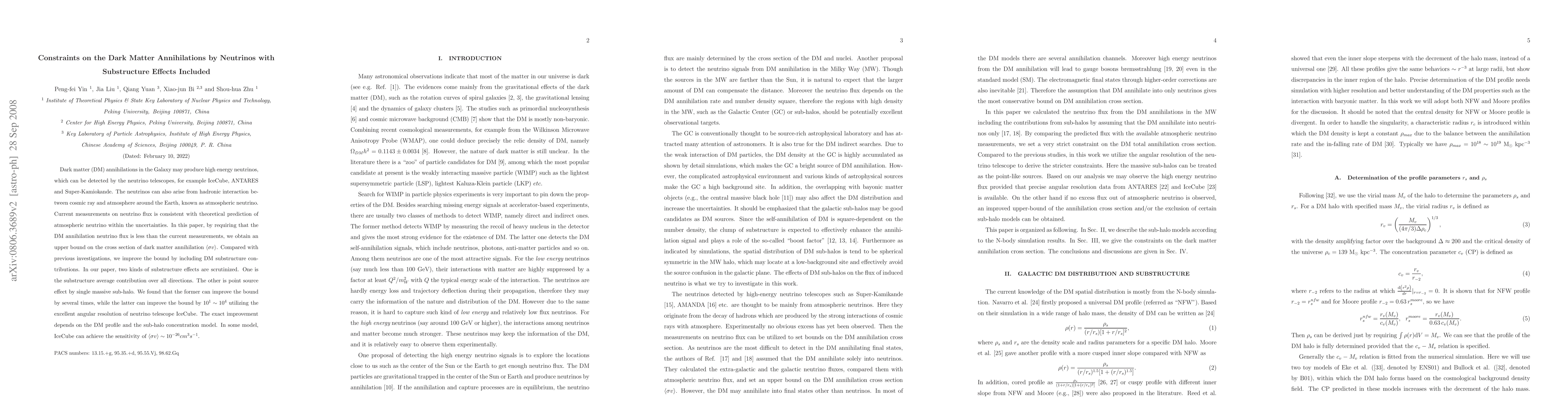 Dark matter (DM) annihilations in the Galaxy may produce high energy neutrinos, which can be detected by the neutrino telescopes, for example IceCube, ANTARES and Super-Kamiokande. The neutrinos can also arise from hadronic interaction between cosmic ray and atmosphere around the Earth, known as atmospheric neutrino. Current measurements on neutrino flux is consistent with theoretical prediction of atmospheric neutrino within the uncertainties. In this paper, by requiring that the DM annihilation neutrino flux is less than the current measurements, we obtain an upper bound on the cross section of dark matter annihilation $ < {\sigma v} >$. Compared with previous investigations, we improve the bound by including DM substructure contributions. In our paper, two kinds of substructure effects are scrutinized. One is the substructure average contribution over all directions. The other is point source effect by single massive sub-halo. We found that the former can improve the bound by several times, while the latter can improve the bound by $ 10^1 \sim 10^4$ utilizing the excellent angular resolution of neutrino telescope IceCube. The exact improvement depends on the DM profile and the sub-halo concentration model. In some model, IceCube can achieve the sensitivity of $ < {\sigma v} > \sim 10^{- 26} cm^3 s^{- 1} $.