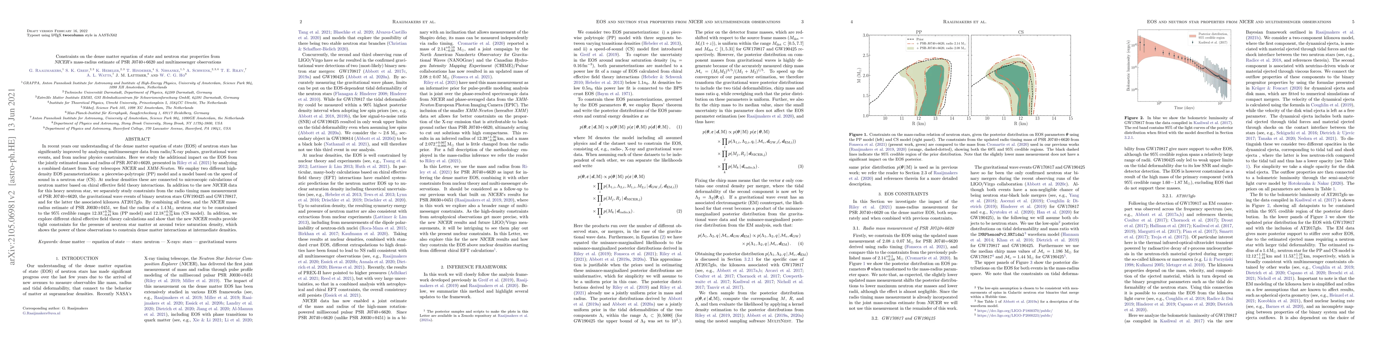 This paper investigates the dense matter equation of state (EOS) of neutron stars using NICER's mass-radius estimate for PSR J0740+6620, combined with multimessenger data from radio pulsars, gravitational waves, and nuclear physics. The study finds the radius of a 1.4 solar mass neutron star to be constrained to 12.33^{+0.76}_{-0.81} km (PP model) and 12.18^{+0.56}_{-0.79} km (CS model), highlighting the impact of NICER data on understanding neutron star matter at intermediate densities.