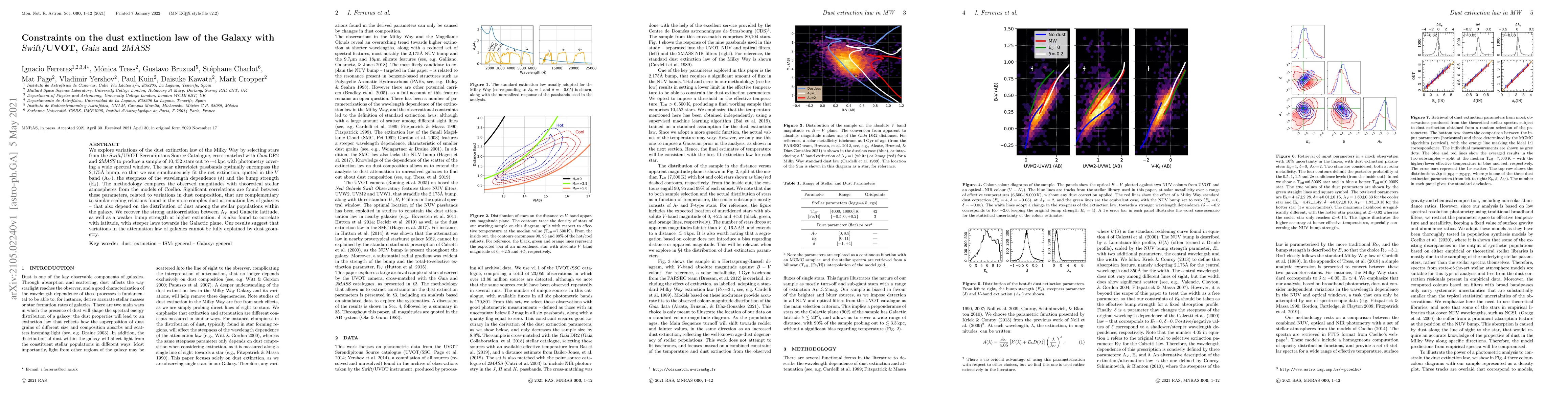 This study investigates the variations in the Milky Way's dust extinction law using a sample of 10,452 stars from Swift/UVOT, Gaia, and 2MASS, finding significant correlations between extinction parameters and Galactic latitude. The results suggest that dust composition, not just geometry, influences the attenuation law of galaxies.