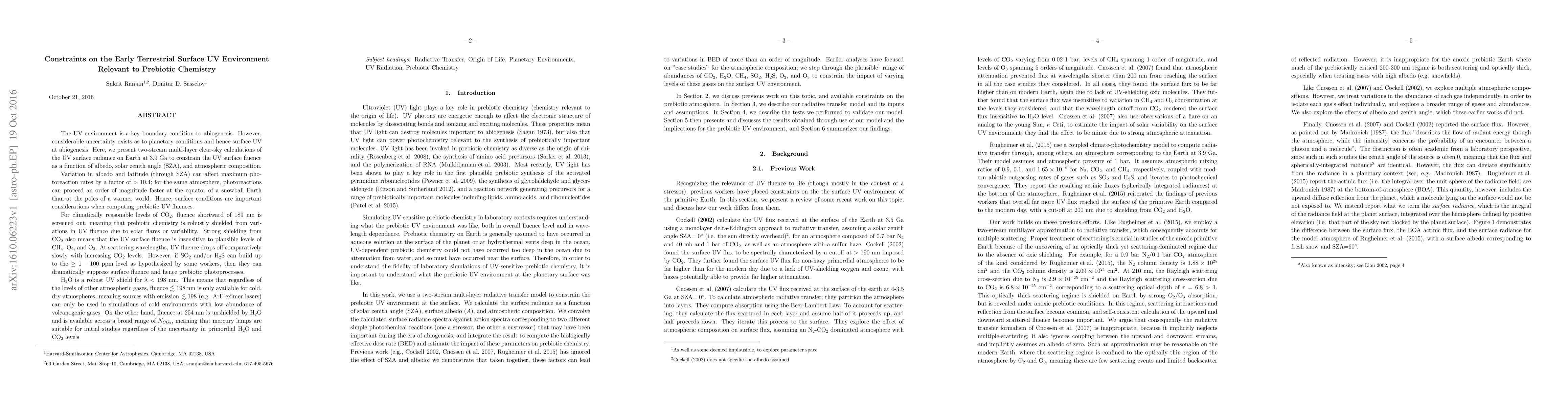 The study presents detailed calculations of early Earth's UV surface radiance, considering albedo, solar zenith angle, and atmospheric compositions, to constrain surface UV fluence for prebiotic chemistry studies.
