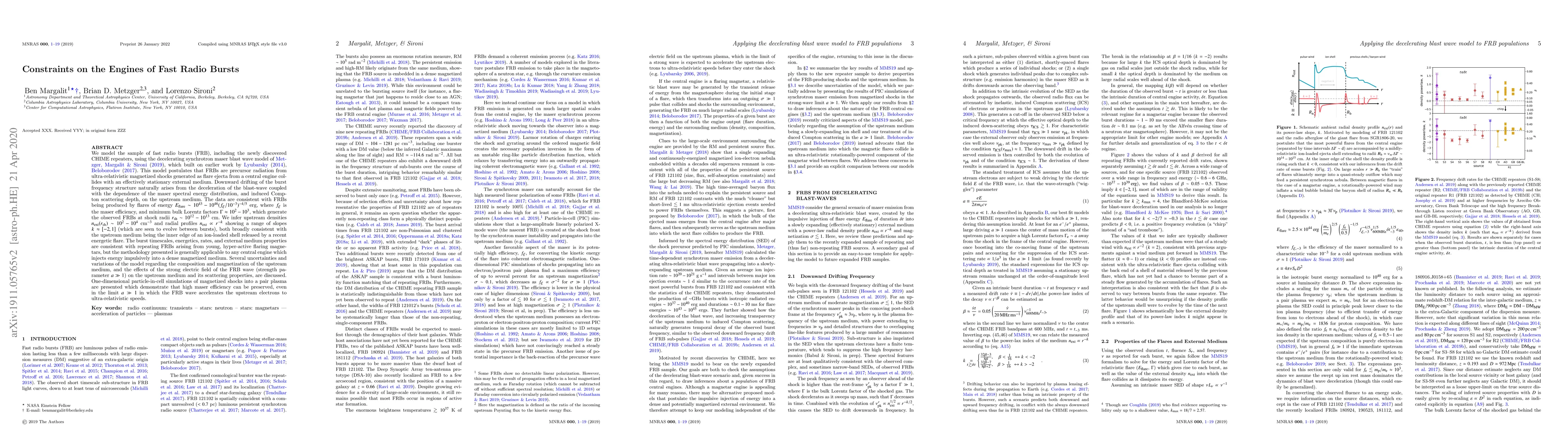 We model the sample of fast radio bursts (FRB), including the newly discovered CHIME repeaters, using the synchrotron blast wave model of Metzger, Margalit & Sironi (2019). This model postulates that FRBs are precursor radiation from ultra-relativistic magnetized shocks generated as flare ejecta from a central engine collide with an effectively stationary external medium. Downward drifting of the burst frequency structure naturally arises from deceleration of the blast-wave. The data are consistent with FRBs being produced by flares of energy $E_{\rm flare} \sim 10^{43}-10^{46}(f_{\xi}/10^{-3})^{-4/5}$ erg, where $f_{\xi}$ is the maser efficiency, and minimum bulk Lorentz factors $\Gamma \approx 10^2-10^3$, which generate the observed FRBs at shock radii $r_{\rm sh} \sim 10^{12}-10^{13}$ cm. We infer upstream densities $n_{\rm ext}(r_{\rm sh}) \sim 10^{2}-10^{4}$ cm$^{-3}$ and radial profiles $n_{\rm ext} \propto r^{-k}$ showing a range of slopes $k \approx [-2,1]$ (which are seen to evolve between bursts), broadly consistent with the upstream medium being the inner edge of an ion-loaded shell released by a recent energetic flare. The burst timescales, energetics, rates, and external medium properties are consistent with repeating FRBs arising from young, hyper-active flaring magnetars, but the methodology presented is generally applicable to any central engine which injects energy impulsively into a dense magnetized medium. Uncertainties and variations of the model are discussed, including the effects of the strong electric field of the FRB wave (strength parameter $a \gg 1$) on the upstream medium. One-dimensional particle-in-cell simulations of magnetized shocks into a pair plasma are presented which demonstrate that high maser efficiency can be preserved, even in the limit $a \gg 1$ in which the FRB wave accelerates the upstream electrons to ultra-relativistic speeds.