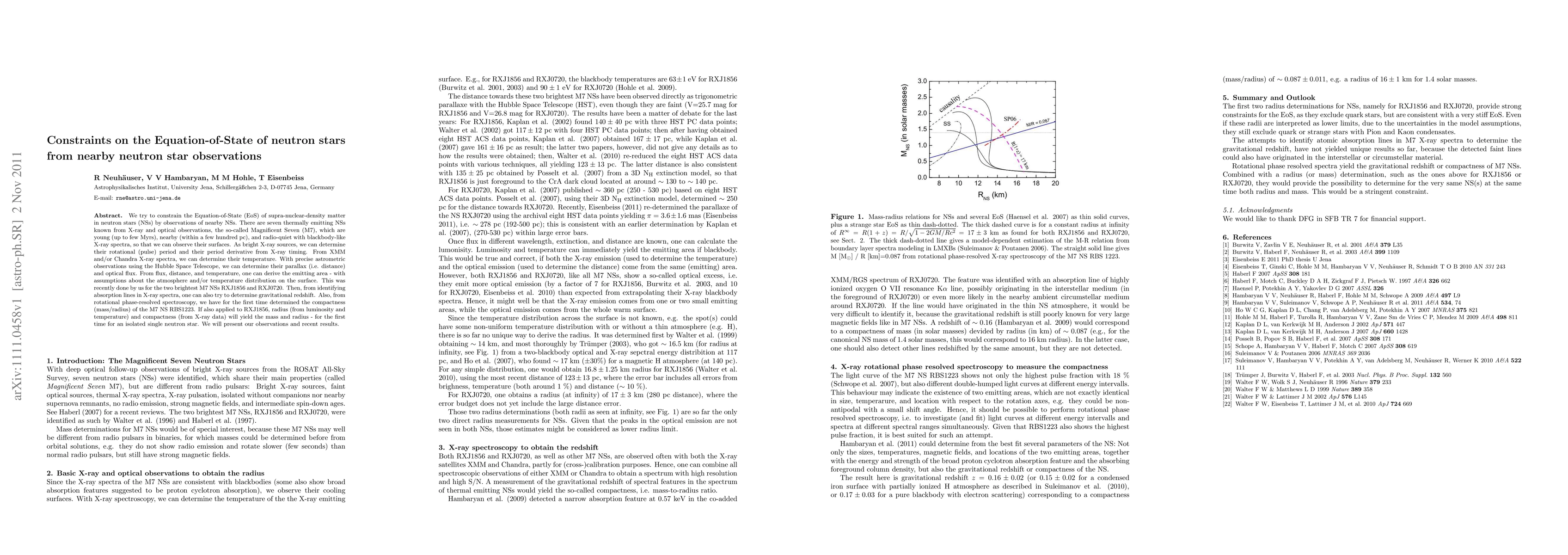 We try to constrain the Equation-of-State (EoS) of supra-nuclear-density matter in neutron stars (NSs) by observations of nearby NSs. There are seven thermally emitting NSs known from X-ray and optical observations, the so-called Magnificent Seven (M7), which are young (up to few Myrs), nearby (within a few hundred pc), and radio-quiet with blackbody-like X-ray spectra, so that we can observe their surfaces. As bright X-ray sources, we can determine their rotational (pulse) period and their period derivative from X-ray timing. From XMM and/or Chandra X-ray spectra, we can determine their temperature. With precise astrometric observations using the Hubble Space Telescope, we can determine their parallax (i.e. distance) and optical flux. From flux, distance, and temperature, one can derive the emitting area - with assumptions about the atmosphere and/or temperature distribution on the surface. This was recently done by us for the two brightest M7 NSs RXJ1856 and RXJ0720. Then, from identifying absorption lines in X-ray spectra, one can also try to determine gravitational redshift. Also, from rotational phase-resolved spectroscopy, we have for the first time determined the compactness (mass/radius) of the M7 NS RBS1223. If also applied to RXJ1856, radius (from luminosity and temperature) and compactness (from X-ray data) will yield the mass and radius - for the first time for an isolated single neutron star. We will present our observations and recent results.