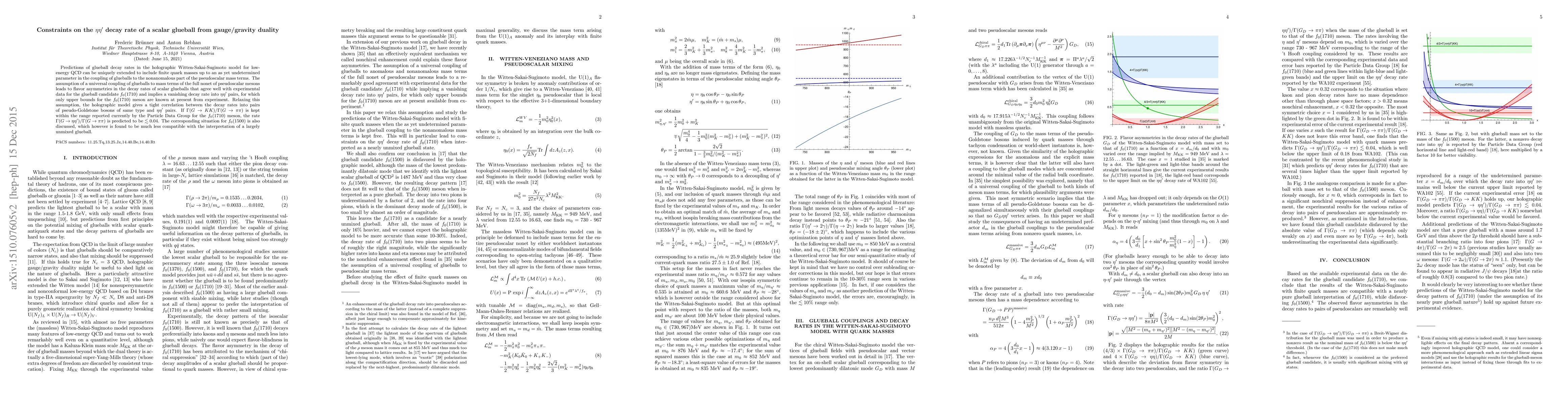 Predictions of glueball decay rates in the holographic Witten-Sakai-Sugimoto model for low-energy QCD can be uniquely extended to include finite quark masses up to an as yet undetermined parameter in the coupling of glueballs to the nonanomalous part of the pseudoscalar mass terms. The assumption of a universal coupling of glueballs to mass terms of the full nonet of pseudoscalar mesons leads to flavor asymmetries in the decay rates of scalar glueballs that agree well with experimental data for the glueball candidate $f_0(1710)$ and implies a vanishing decay rate into $\eta\eta'$ pairs, for which only upper bounds for the $f_0(1710)$ meson are known at present from experiment. Relaxing this assumption, the holographic model gives a tight correlation between the decay rates into pairs of pseudo-Goldstone bosons of same type and $\eta\eta'$ pairs. If $\Gamma(G\to KK)/\Gamma(G\to\pi\pi)$ is kept within the range reported currently by the Particle Data Group for the $f_0(1710)$ meson, the rate $\Gamma(G\to\eta\eta')/\Gamma(G\to\pi\pi)$ is predicted to be $\lesssim 0.04$. The corresponding situation for $f_0(1500)$ is also discussed, which however is found to be much less compatible with the interpretation of a largely unmixed glueball.