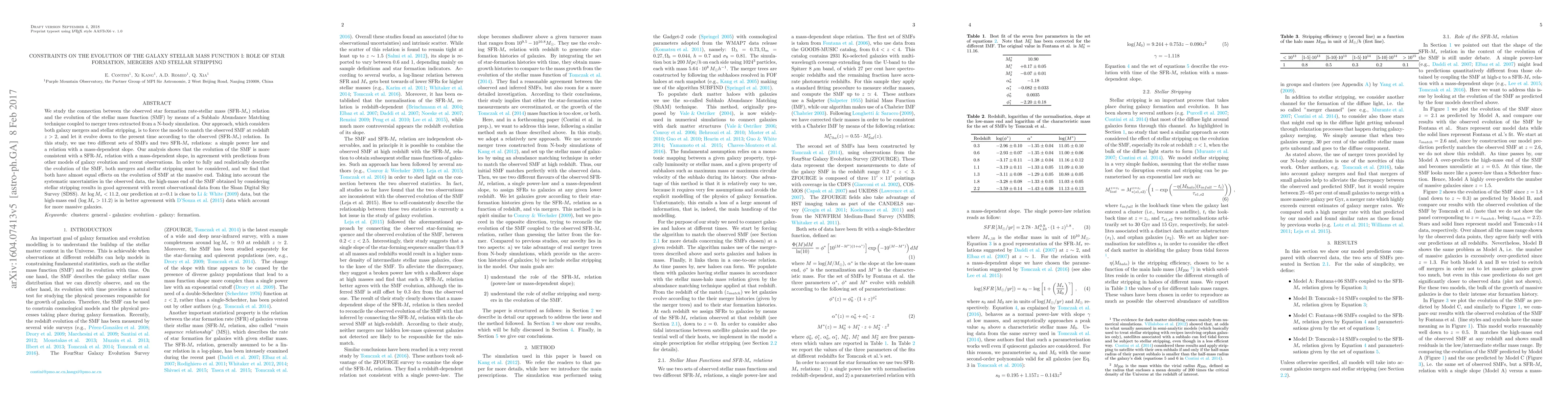 This paper investigates the evolution of the galaxy stellar mass function (SMF) using a Subhalo Abundance Matching technique, focusing on the roles of star formation, mergers, and stellar stripping. The study finds that a mass-dependent star formation rate-stellar mass relation better describes SMF evolution, with both mergers and stellar stripping significantly impacting the high-mass end of the SMF.