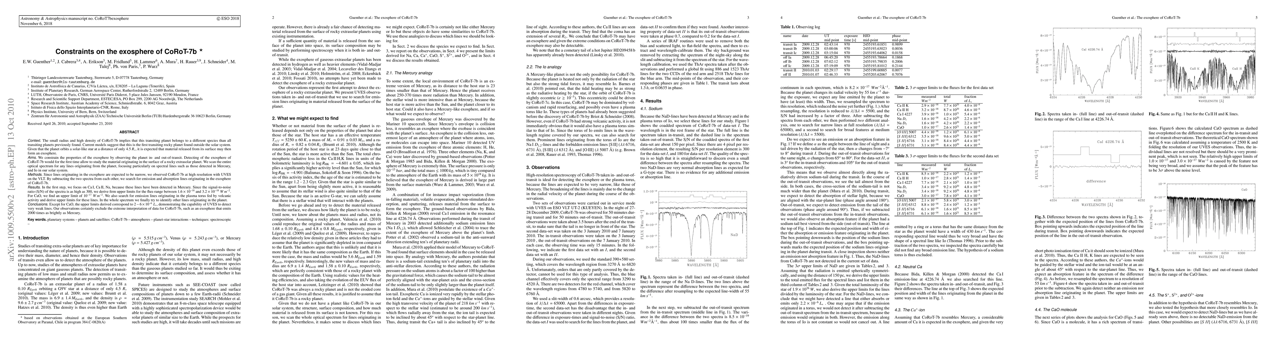 CONTEXT: The small radius and high density of CoRoT-7b implies that this transiting planet belongs to a differen t species than all transiting planets previously found. Current models suggest that this is the first transiting rocky planet found outside the solar system. Given that the planet orbits a solar-like star at a distance of on ly 4.5 R*, it is expected that material released from its surface may then form an exosphere. AIMS: We constrai n the properties of the exosphere by observing the planet in- and out-of-transit. Detecting of the exosphere of CoRoT-7b would for the first time allow to study the material originating in the surface of a rocky extrasolar planet. We scan the entire optical spectrum for any lines originating from the planet, focusing particularly on spectral lines such as those detected in Mercury, and Io in our solar system. METHODS: Since lines originating in the exosphere are expected to be narrow, we observed CoRoT-7b at high resolution with UVES on the VLT. By subtracting the two spectra from each other, we search for emission and absorption lines originating in the exosph ere of CoRoT-7b. RESULTS: In the first step, we focus on Ca I, Ca II, Na, because these lines have been detected in Mercury. Since the signal-to-noise ratio (S/N) of the spectra is as high as 300, we derive firm upper limits for the flux-range between 1.6E-18 and 3.2E-18 Wm**-2. For CaO, we find an upper limit of E-17 Wm**-2. We also search for emission lines originating in the plasma torus fed by volcanic activity and derive upper limits for these lines. In the whole spectrum we finally try to identify other lines originating in the planet.