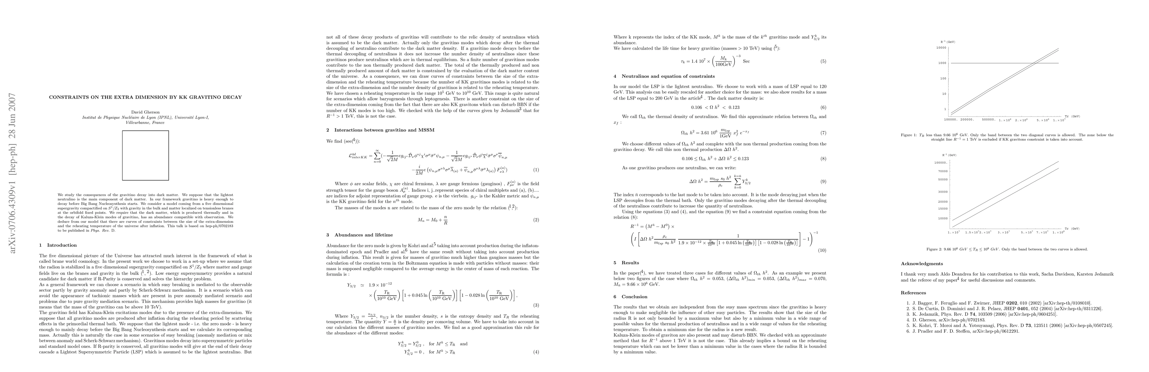 We study the consequences of the gravitino decay into dark matter. We suppose that the lightest neutralino is the main component of dark matter. In our framework gravitino is heavy enough to decay before Big Bang Nucleosynthesis starts. We consider a model coming from a five dimensional supergravity compactified on $S^1/Z_2$ with gravity in the bulk and matter localized on tensionless branes at the orbifold fixed points. We require that the dark matter, which is produced thermally and in the decay of Kaluza-Klein modes of gravitino, has an abundance compatible with observation. We deduce from our model that there are curves of constraints between the size of the extra-dimension and the reheating temperature of the universe after inflation. This talk is based on hep-ph/0702183 to be published in \PRD.