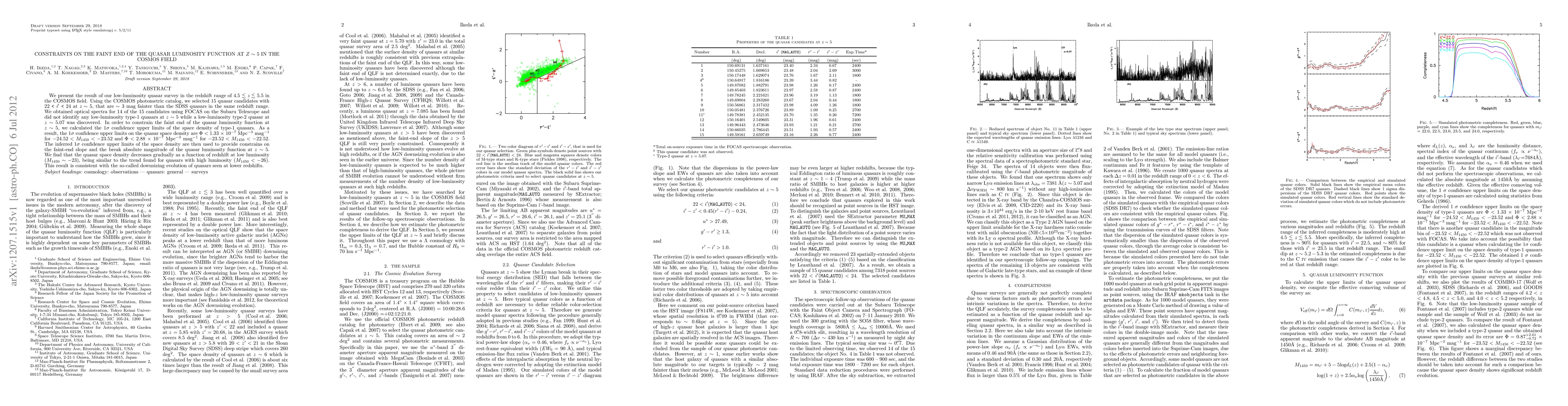 This study investigates low-luminosity quasars at z~5 in the COSMOS field, identifying 15 quasar candidates fainter than SDSS quasars. No low-luminosity type-1 quasars were found, but a type-2 quasar was discovered. The study provides constraints on the faint-end quasar luminosity function, finding a gradual decrease in quasar space density at low luminosity, consistent with the downsizing evolution trend.