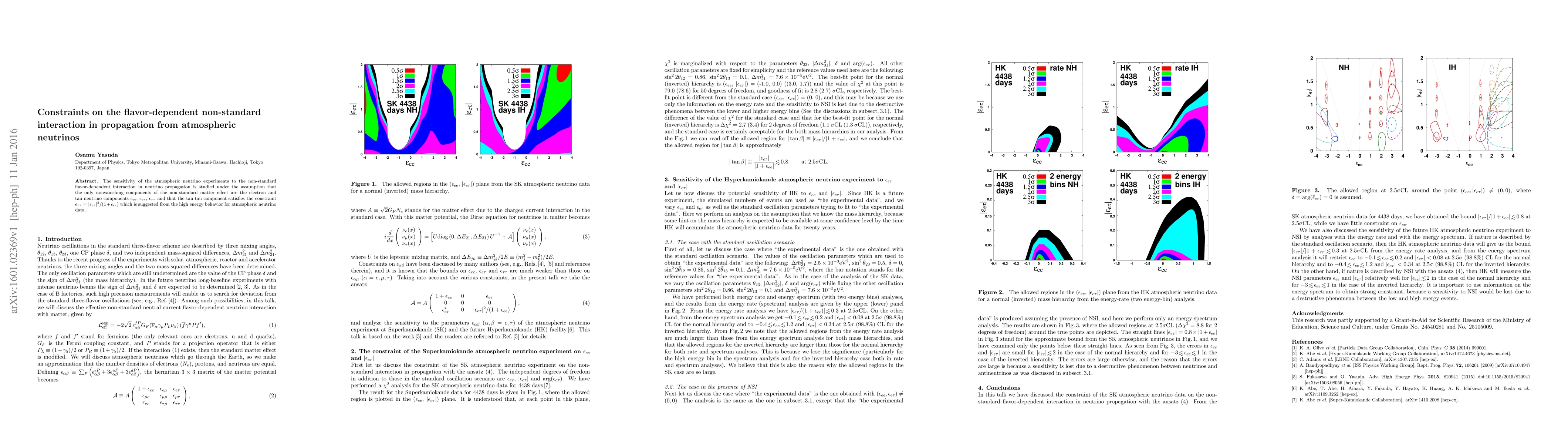 The sensitivity of the atmospheric neutrino experiments to the non-standard flavor-dependent interaction in neutrino propagation is studied under the assumption that the only nonvanishing components of the non-standard matter effect are the electron and tau neutrino components $\epsilon_{ee}$, $\epsilon_{e\tau}$, $\epsilon_{\tau\tau}$ and that the tau-tau component satisfies the constraint $\epsilon_{\tau\tau}=|\epsilon_{e\tau}|^2/(1+\epsilon_{ee})$ which is suggested from the high energy behavior for atmospheric neutrino data.