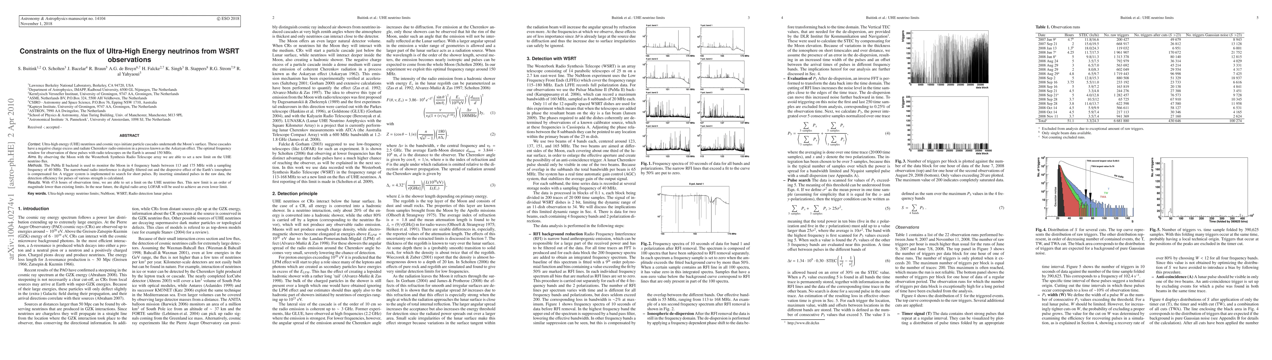 Ultra-high energy (UHE) neutrinos and cosmic rays initiate particle cascades underneath the Moon's surface. These cascades have a negative charge excess and radiate Cherenkov radio emission in a process known as the Askaryan effect. The optimal frequency window for observation of these pulses with radio telescopes on the Earth is around 150 MHz. By observing the Moon with the Westerbork Synthesis Radio Telescope array we are able to set a new limit on the UHE neutrino flux. The PuMa II backend is used to monitor the Moon in 4 frequency bands between 113 and 175 MHz with a sampling frequency of 40 MHz. The narrowband radio interference is digitally filtered out and the dispersive effect of the Earth's ionosphere is compensated for. A trigger system is implemented to search for short pulses. By inserting simulated pulses in the raw data, the detection efficiency for pulses of various strength is calculated. With 47.6 hours of observation time, we are able to set a limit on the UHE neutrino flux. This new limit is an order of magnitude lower than existing limits. In the near future, the digital radio array LOFAR will be used to achieve an even lower limit.