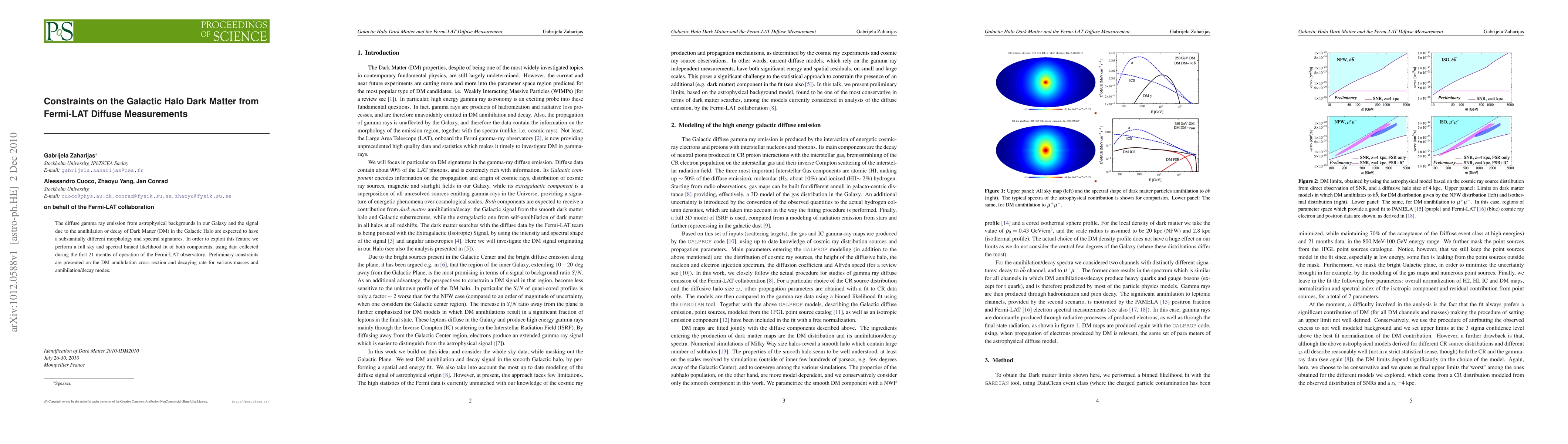 This paper uses Fermi-LAT data to distinguish between diffuse gamma ray emissions from astrophysical backgrounds and potential Dark Matter signals in the Galactic Halo, providing preliminary constraints on the DM annihilation cross section and decay rates for various masses and modes.
