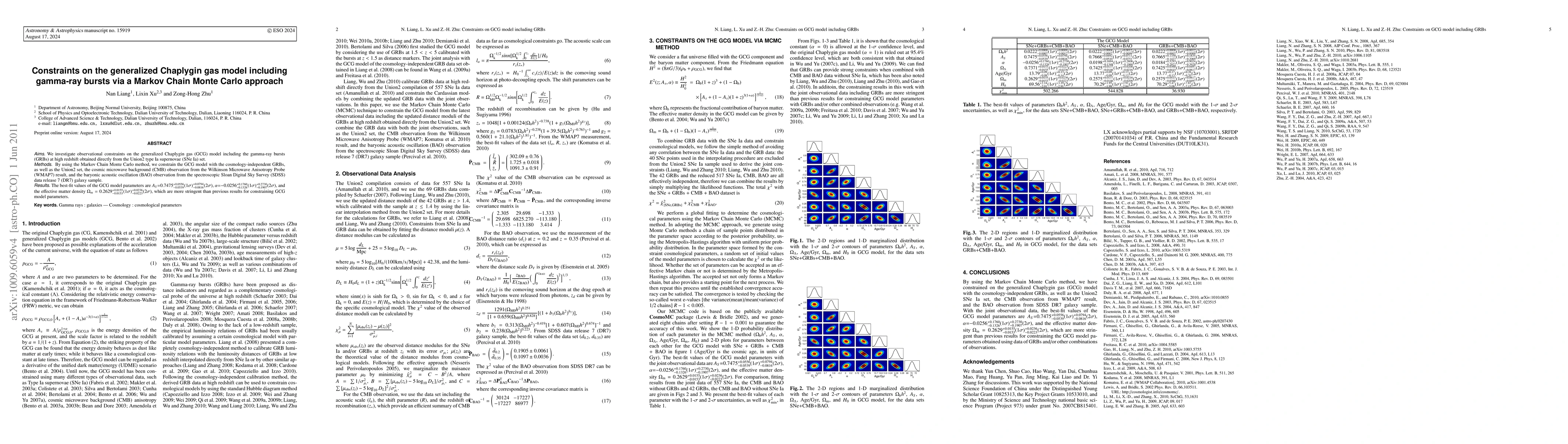 This paper uses the Markov Chain Monte Carlo method to constrain the generalized Chaplygin gas model, incorporating gamma-ray bursts and observational data from Type Ia supernovae, CMB, and BAO. The best-fit parameters yield more stringent constraints than previous results.
