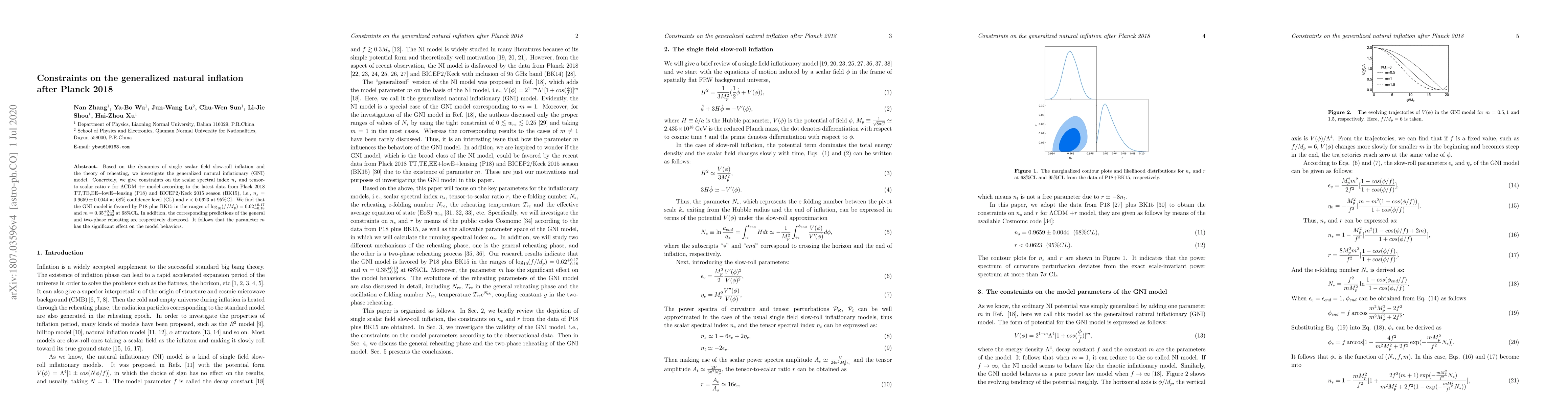 This research paper constrains the generalized natural inflation (GNI) model using Planck 2018 data, finding $n_s=0.9659pm0.0044$ and $r<0.0623$. The GNI model is favored within specific ranges of parameters, particularly $m=0.35^{+0.13}_{-0.23}$. The study also examines the impact of parameter $m$ on model behaviors, along with general and two-phase reheating predictions.