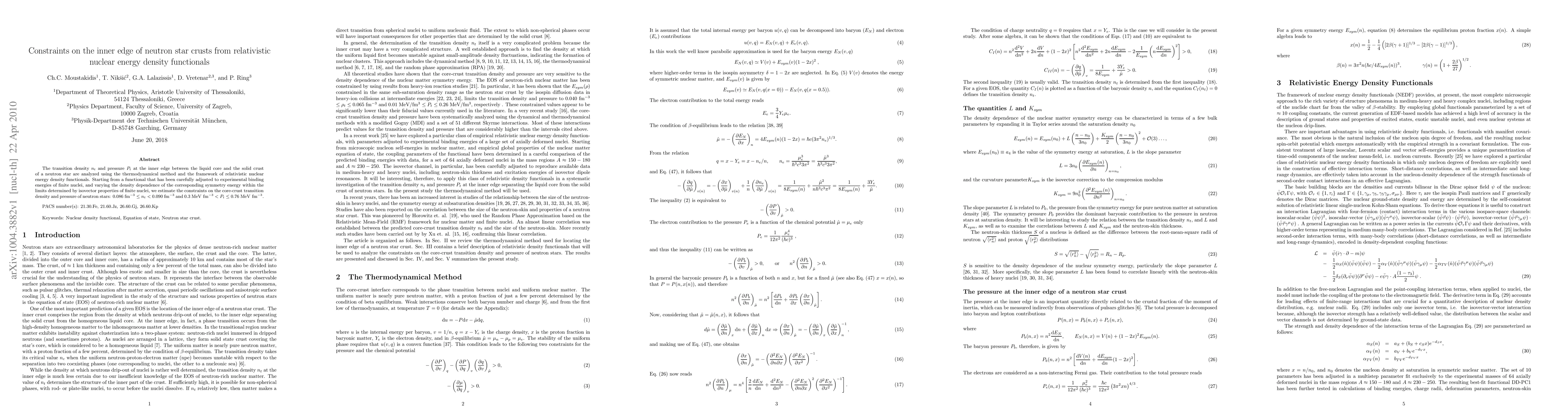 This paper uses relativistic nuclear energy density functionals to analyze the transition density and pressure at the inner edge of neutron star crusts, finding constraints of $0.086 \ {\rm fm}^{-3} \leq n_t < 0.090 \ {\rm fm}^{-3}$ and $0.3\ {\rm MeV \ fm}^{-3} < P_t \leq 0.76 \ {\rm MeV \ fm}^{-3}$. The study employs a functional adjusted to experimental nuclear binding data.