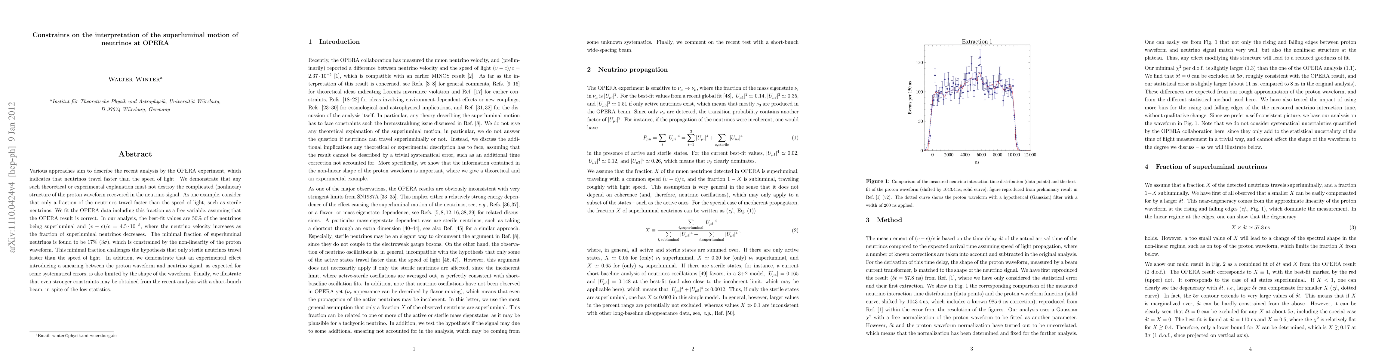 The paper discusses constraints on interpretations of the OPERA experiment's claim of superluminal neutrino speeds, emphasizing the preservation of the proton waveform's complex structure. The analysis finds a minimal 17% fraction of superluminal neutrinos (3 sigma), challenging the idea that only sterile neutrinos travel faster than light, and also limits potential experimental effects that could distort the proton waveform.