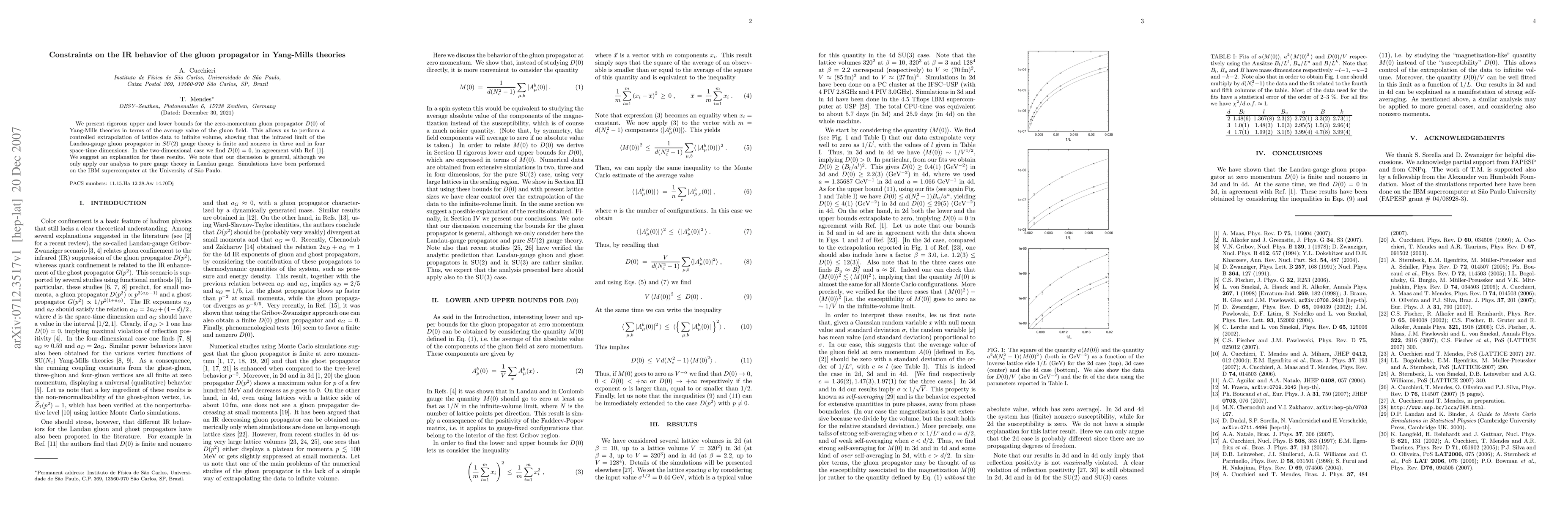 This paper establishes rigorous bounds for the zero-momentum gluon propagator in Yang-Mills theories, demonstrating that it is finite and nonzero in three and four dimensions, while it is zero in two dimensions. The findings are based on lattice data extrapolation and simulations on an IBM supercomputer.