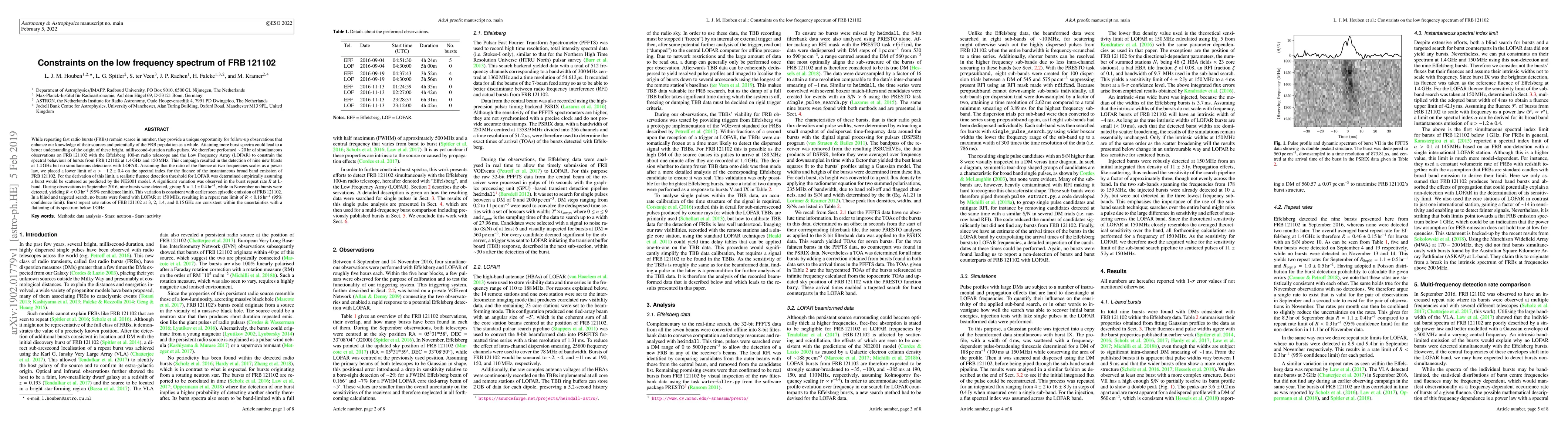 This study used Effelsberg and LOFAR telescopes to observe FRB 121102, detecting nine new bursts at 1.4 GHz but none at 150 MHz, establishing a lower limit for the spectral index of the burst's fluence. The observed burst repeat rate varied significantly, consistent with the source's episodic emission behavior.