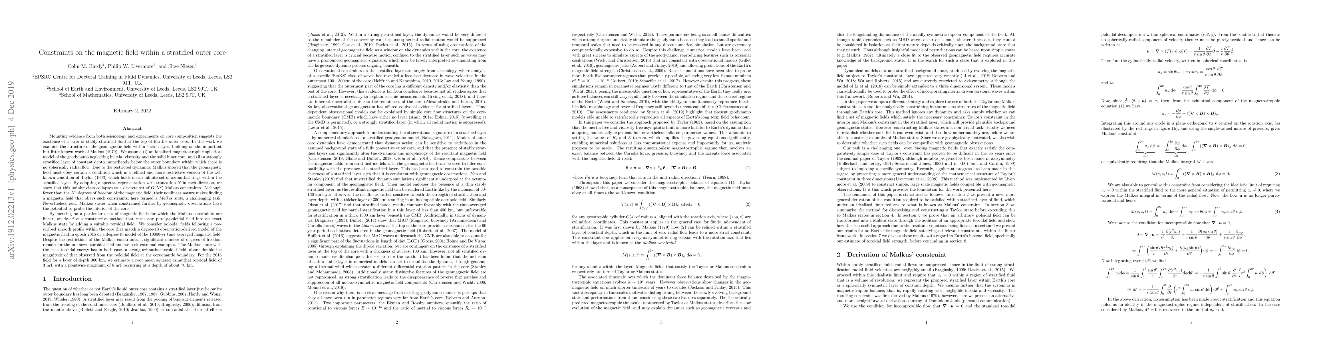 Researchers found that a magnetic field within Earth's outer core, constrained by a stratified layer, can have a strong azimuthal toroidal field with values up to 8 mT at the core-mantle boundary.