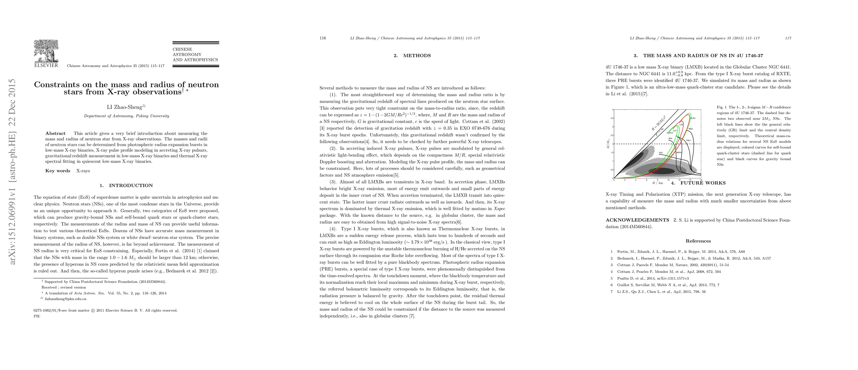 This paper explores methods for determining neutron star mass and radius through X-ray observations, including photospheric radius expansion bursts, pulse profile modeling, gravitational redshift measurements, and thermal spectral fitting. These techniques provide constraints on neutron star properties.