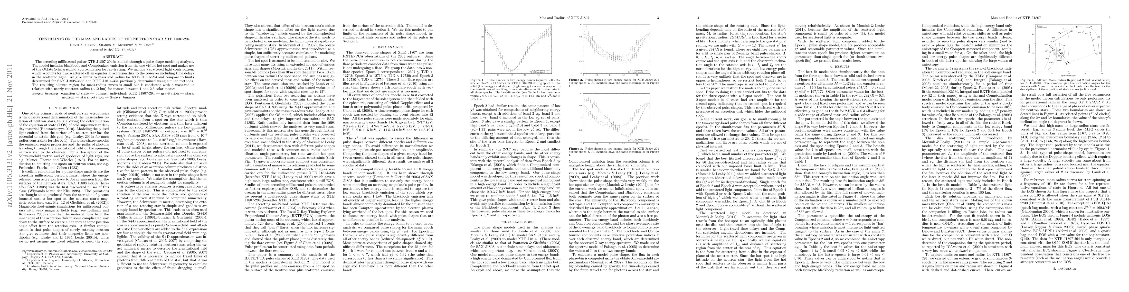The accreting millisecond pulsar XTE J1807-294 is studied through a pulse shape modeling analysis. The model includes blackbody and Comptonized emission from the one visible hot spot and makes use of the Oblate Schwarzschild approximation for ray-tracing. We include a scattered light contribution, which accounts for flux scattered off an equatorial accretion disk to the observer including time delays in the scattered light. We give limits to mass and radius for XTE J1807-294 and compare to limits determined for SAX J1808-3658 and XTE J1814-334 previously determined using similar methods. The resulting allowed region for mass-radius curves is small but is consistent with a mass-radius relation with nearly constant radius (~12 km) for masses between 1 and 2.5 solar masses.