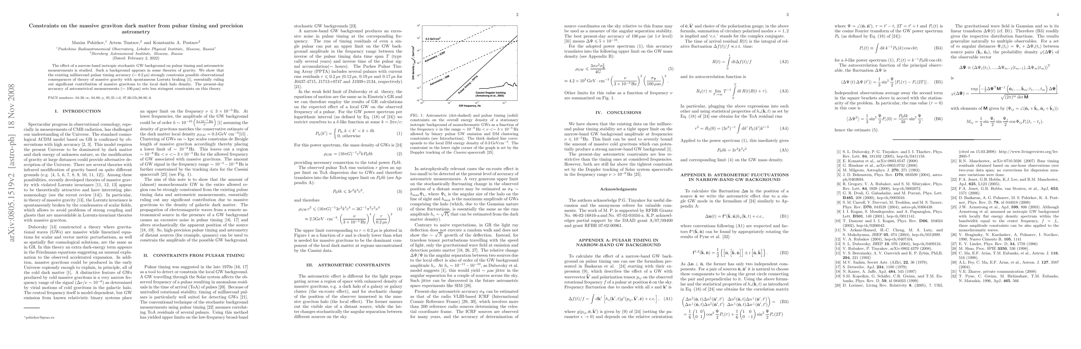 The research uses pulsar timing and astrometry to constrain the massive graviton dark matter theories. Existing millisecond pulsar timing accuracy effectively rules out substantial massive graviton contributions to local dark halo density. Astrometric measurements, while less stringent, also set constraints on these theories.