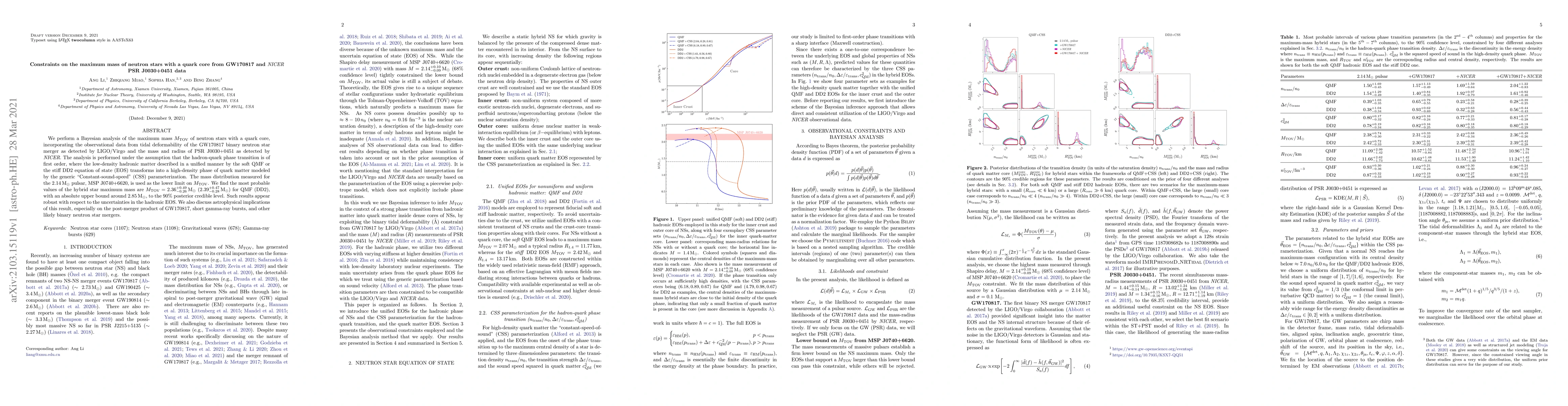 This study uses Bayesian analysis to constrain the maximum mass of neutron stars with a quark core, combining data from the GW170817 merger and the NICER observations of PSR J0030+0451. The analysis finds that the maximum mass is likely around $2.36\,{\rm M}_{\odot}$, with an upper bound of $2.85\,{\rm M}_{\odot}$, and discusses implications for the post-merger product of GW170817 and other binary neutron star events.