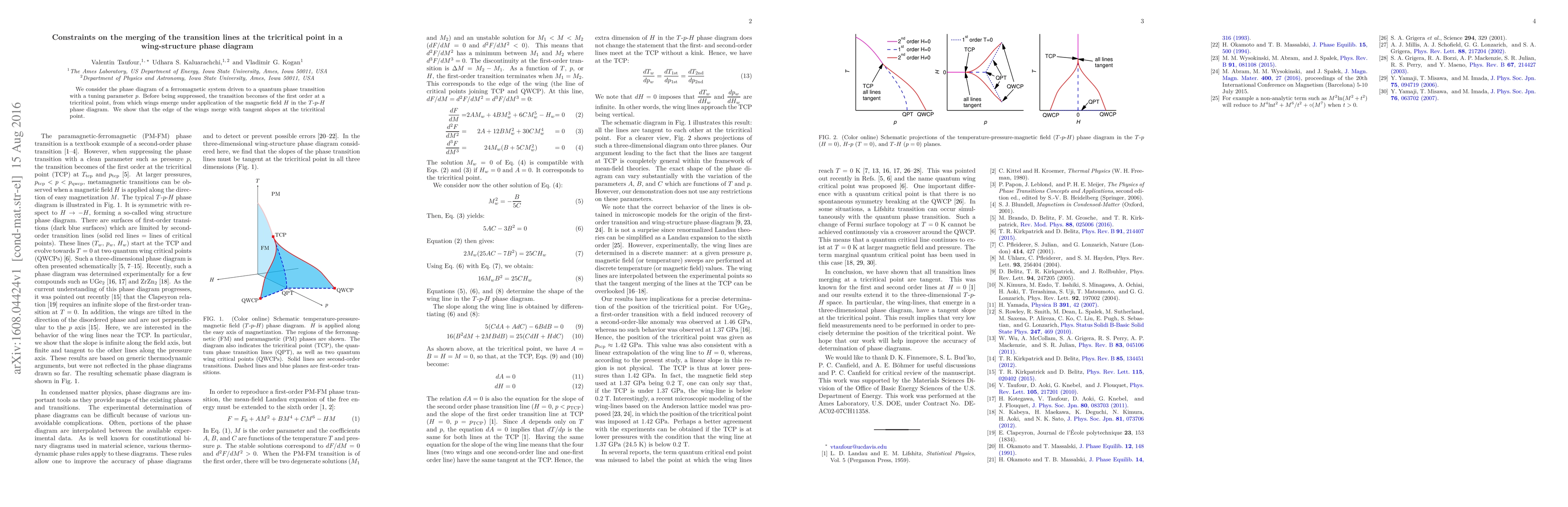 This research investigates the phase diagram of a ferromagnetic system undergoing a quantum phase transition, demonstrating that the transition lines forming the wings merge with tangent slopes at the tricritical point before being suppressed.