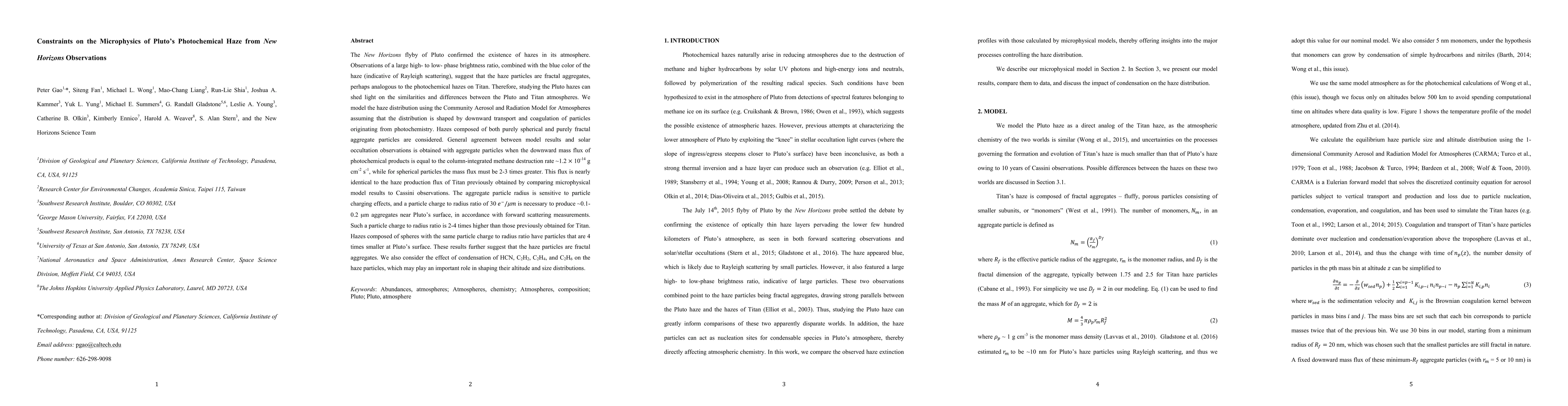 The New Horizons flyby revealed Pluto's atmospheric hazes are fractal aggregates, similar to Titan's, suggesting comparative atmospheric dynamics. Modeling indicates a high downward flux of photochemical products aligns with haze observations, with a charge to radius ratio 2-4 times higher than Titan's, indicating unique microphysical properties.